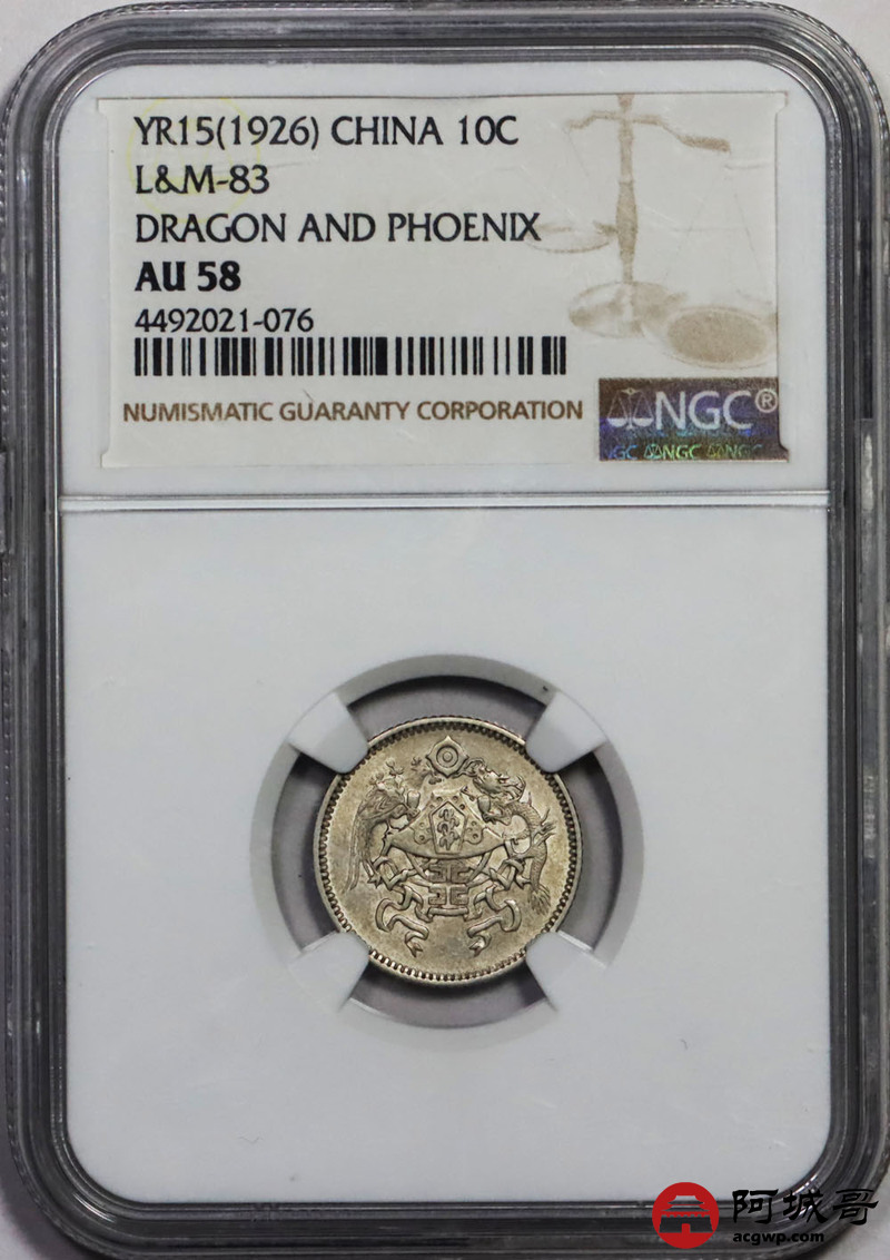 Lot:26 黄油底光 民国十五年龙凤一角NGC AU58