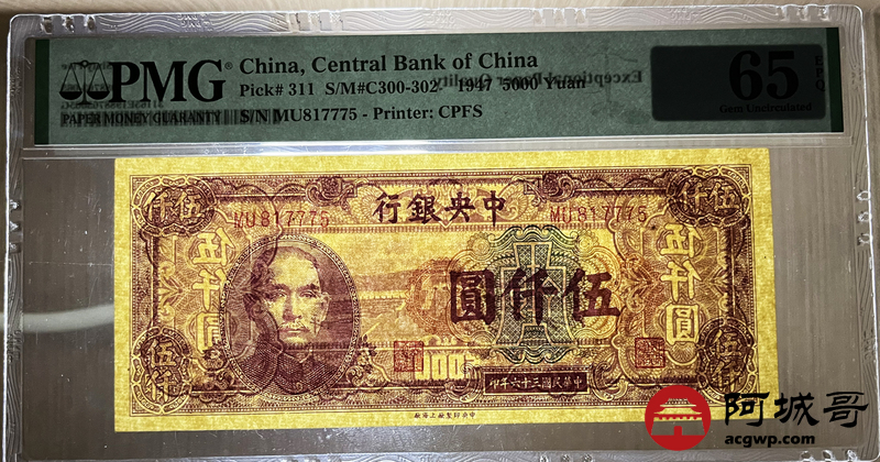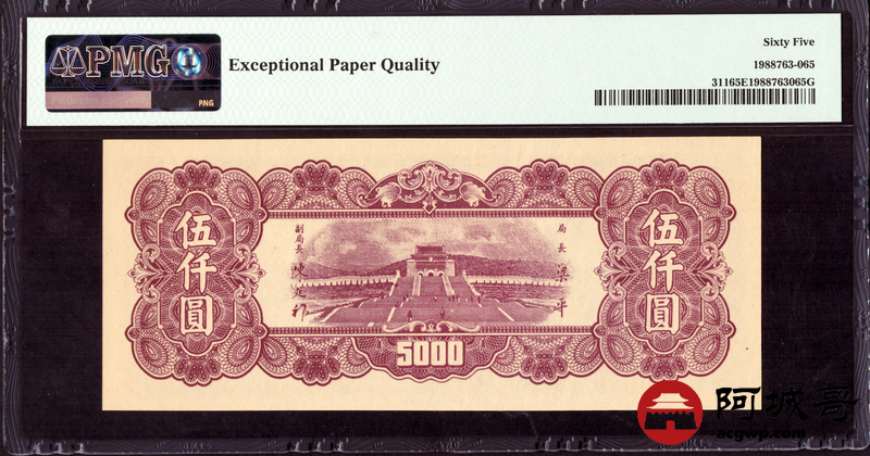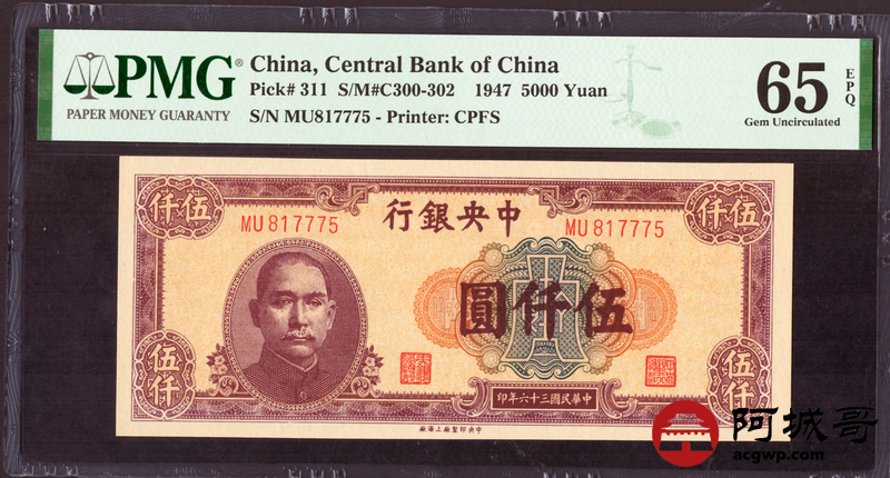 Lot:19 民国36年 中央银行 伍仟圆 PMG 65EPQ 好号无4
