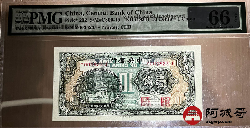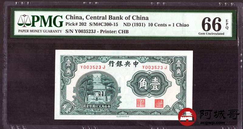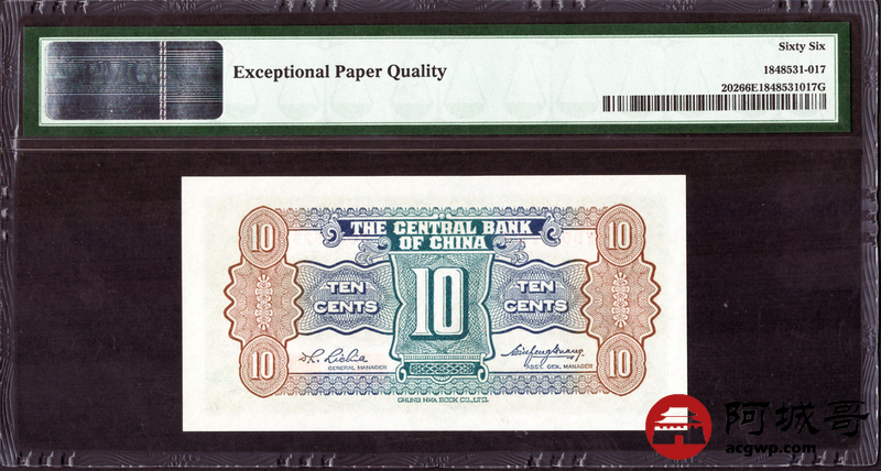 Lot:30 中央银行 壹角 PMG 66EPQ 好号