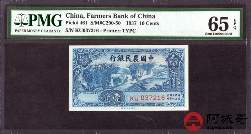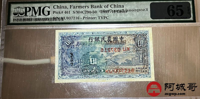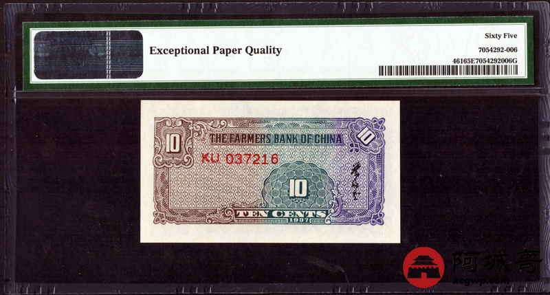 Lot:47 民国26年 中国农民银行 壹角 PMG 65EPQ 好号