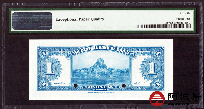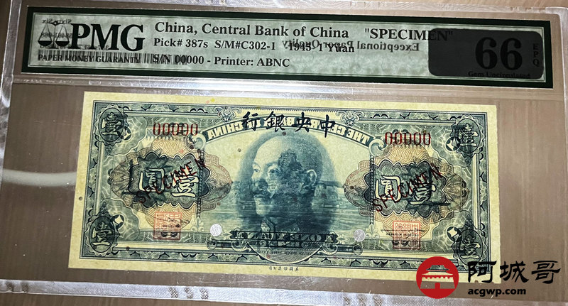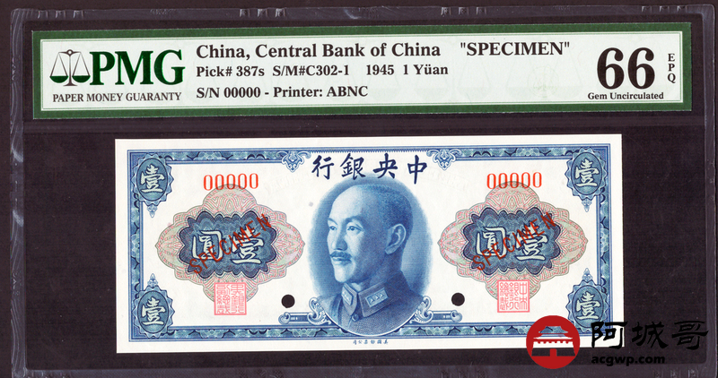 Lot:17 1945年 中央银行 壹圆 PMG 66EPQ 样票