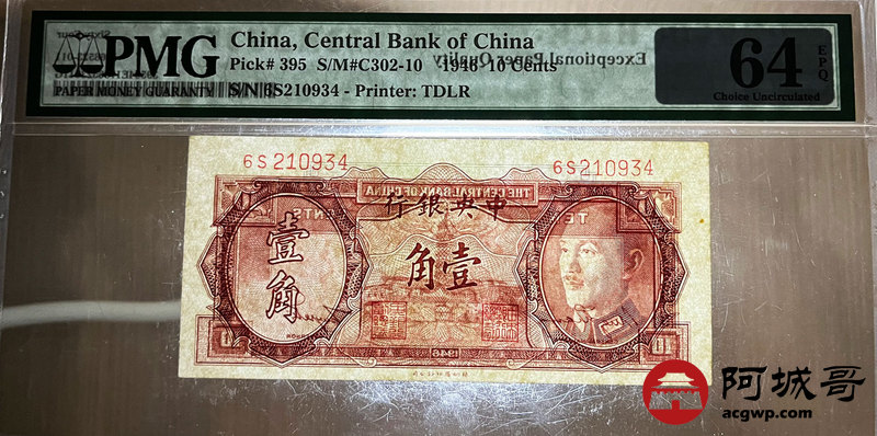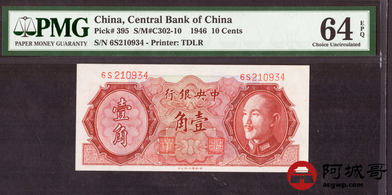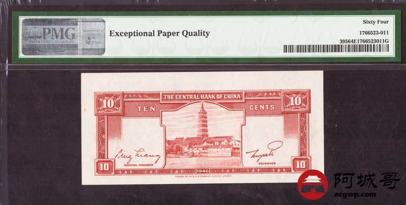 Lot:44 1946年 中央银行 壹角 PMG 64EPQ