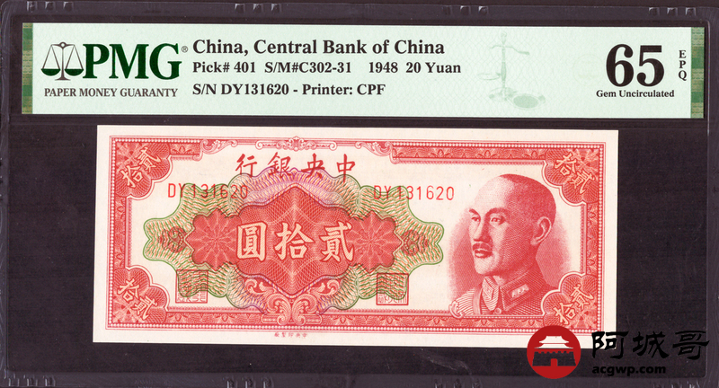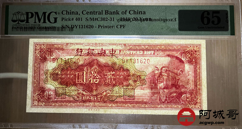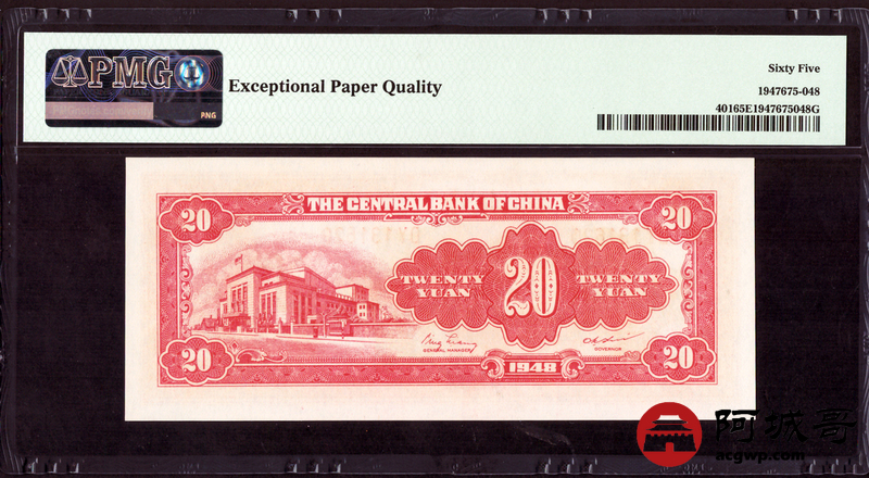 Lot:38 1948年 中央银行 贰拾圆 PMG 65EPQ 好号