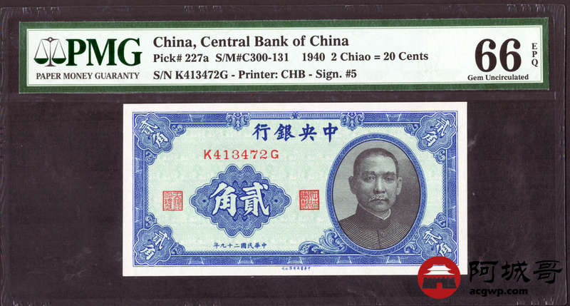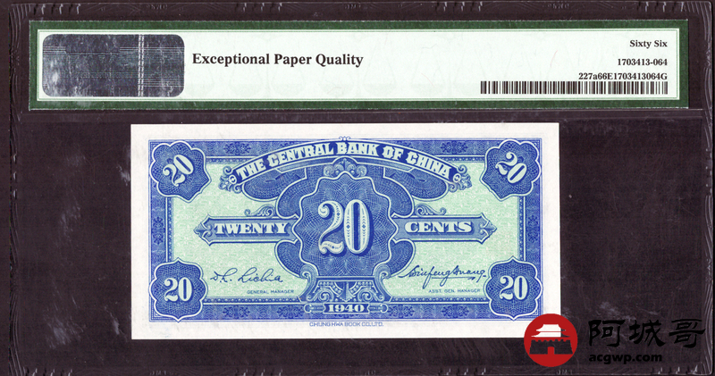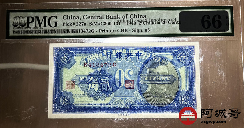 Lot:53 民国29年 中央银行 贰角 PMG 66EPQ
