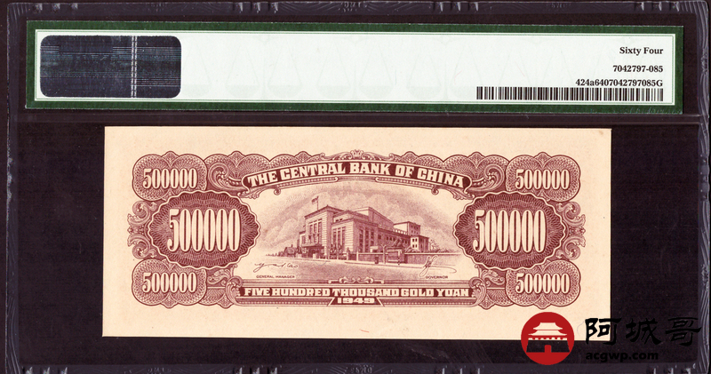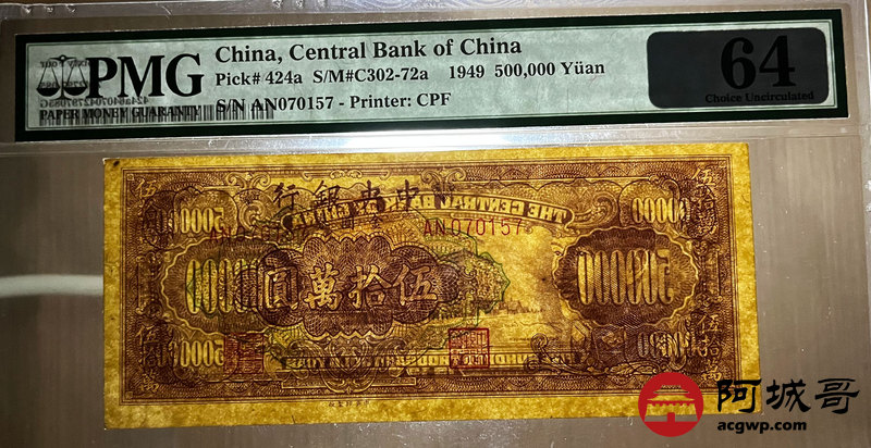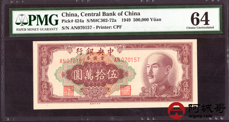 Lot:39 1949年 中央银行 金圆券伍拾萬圆 PMG 64 好号