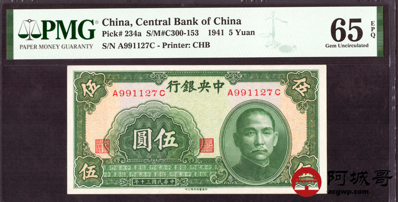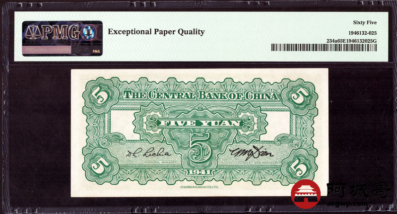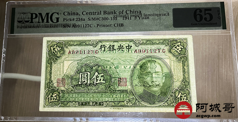 Lot:41 民国30年 中央银行 伍圆 PMG 65EPQ 好号