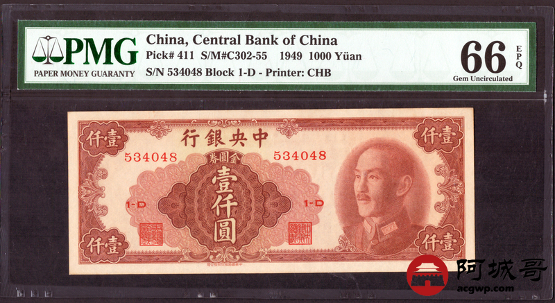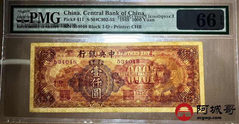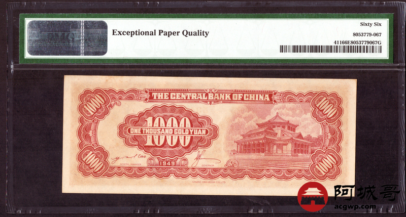 Lot:32 1949年 中央银行 金圆券壹仟圆 PMG 66EPQ
