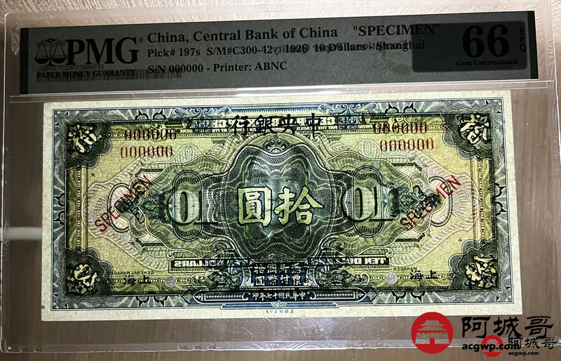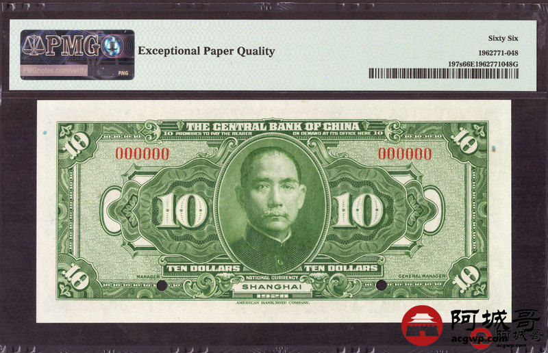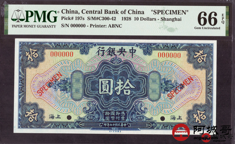 Lot:6 民国17年 中央银行 拾圆 上海地名 PMG 66EPQ 样票