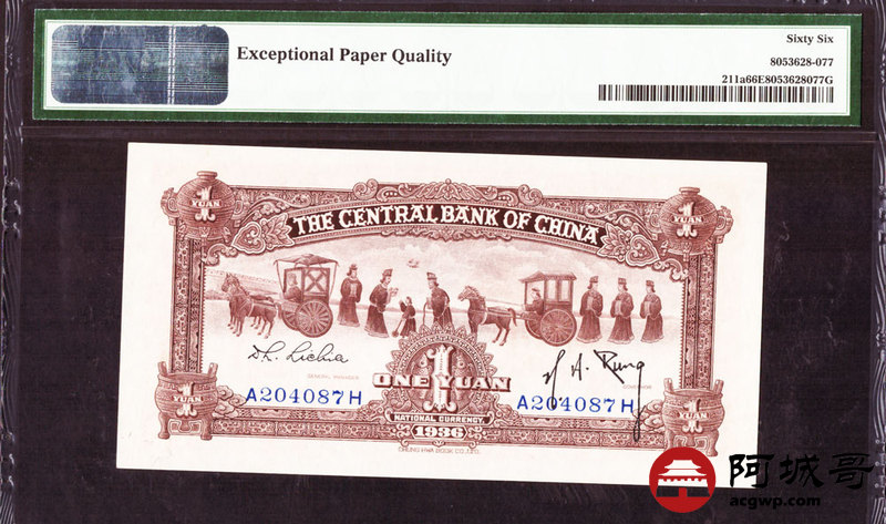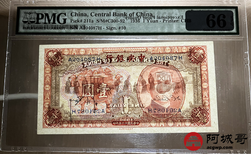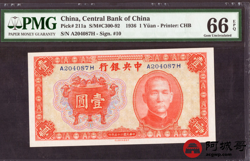 Lot:43 民国25年 中央银行 红宝鼎壹圆 PMG 66EPQ