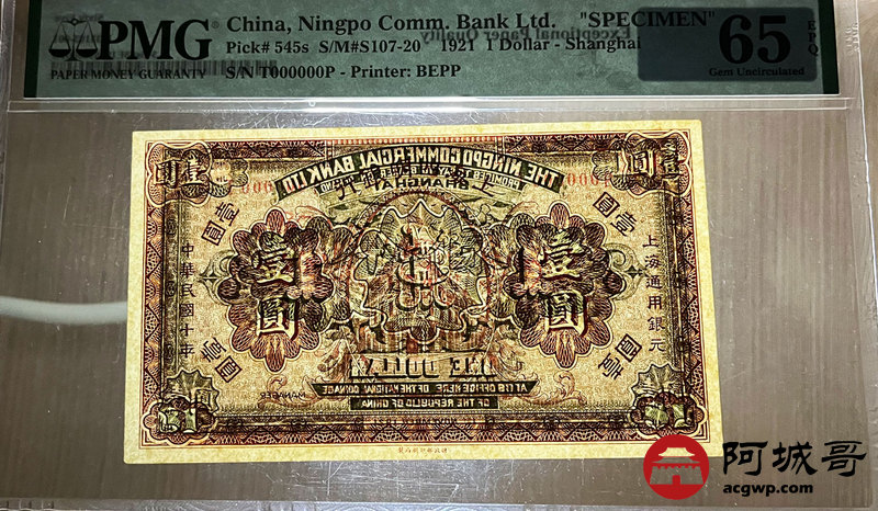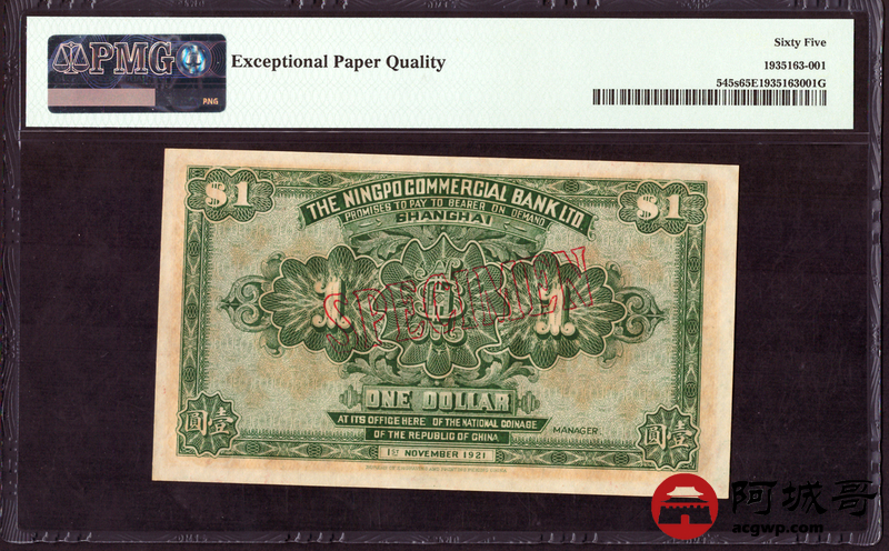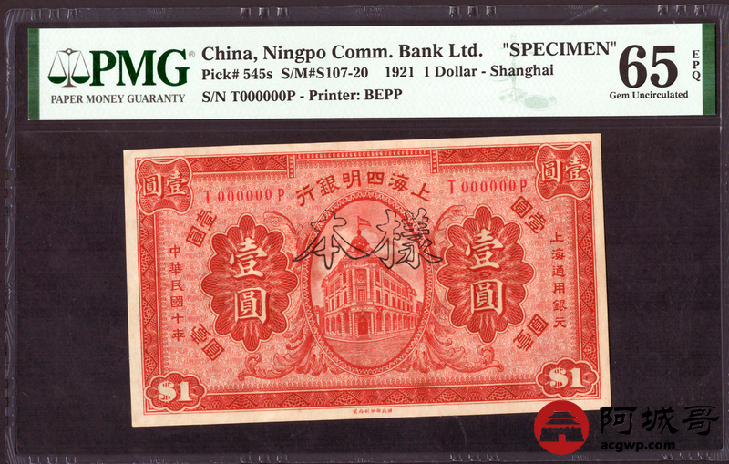 Lot:12 民国10年 壹圆 上海四明银行 上海地名 PMG 65EPQ 样票 亚军分,高于此分仅4枚