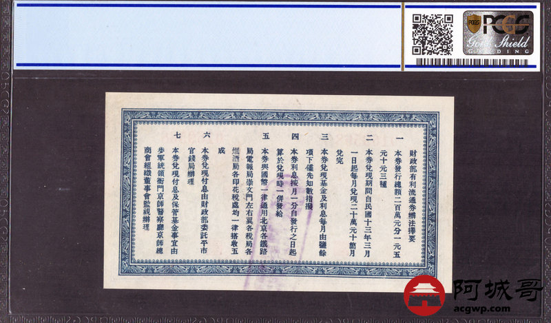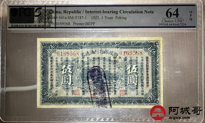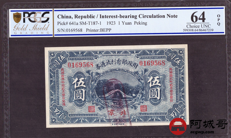 Lot:16 民国12年 财政部有利流通券 伍圆 北京地名 PCGS 64OPQ 好号