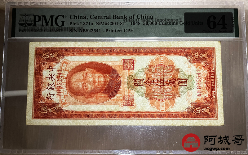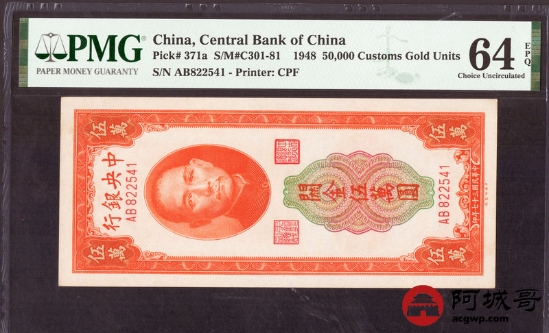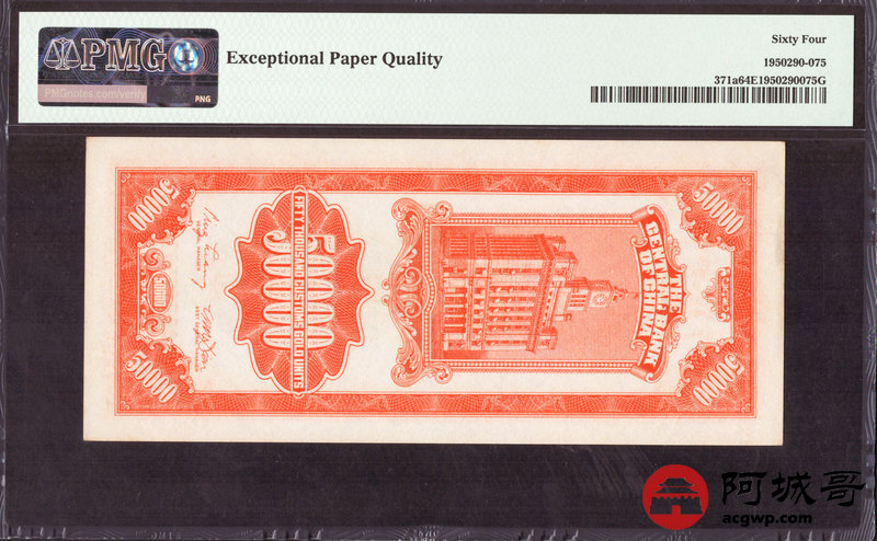 Lot:25 民国37年 中央银行 关金伍萬圆 PMG 64EPQ