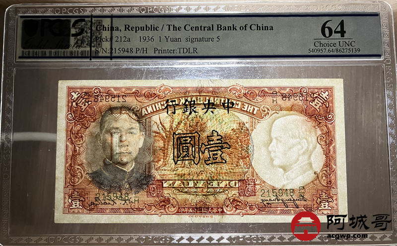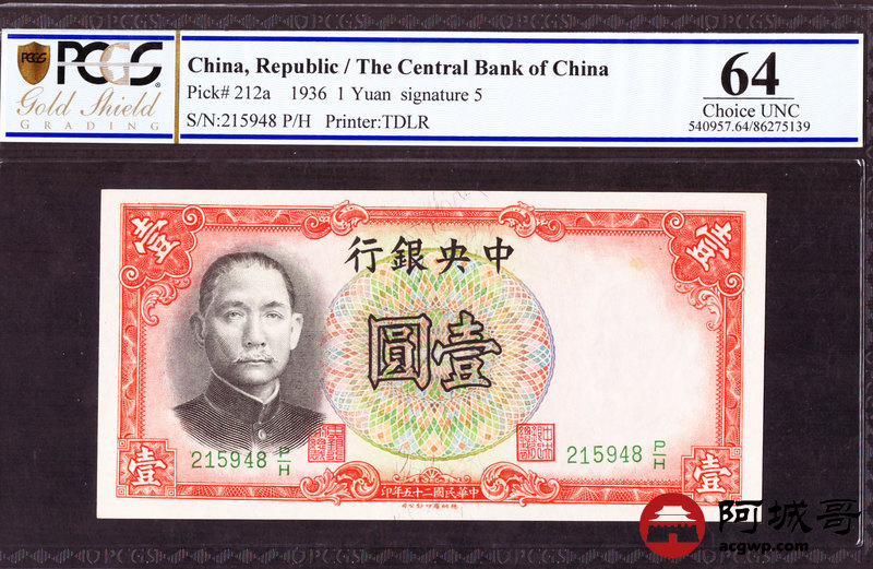 Lot:4 民国25年 中央银行 壹圆 PCGS 64