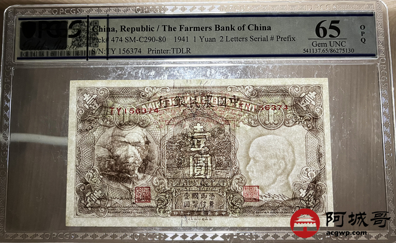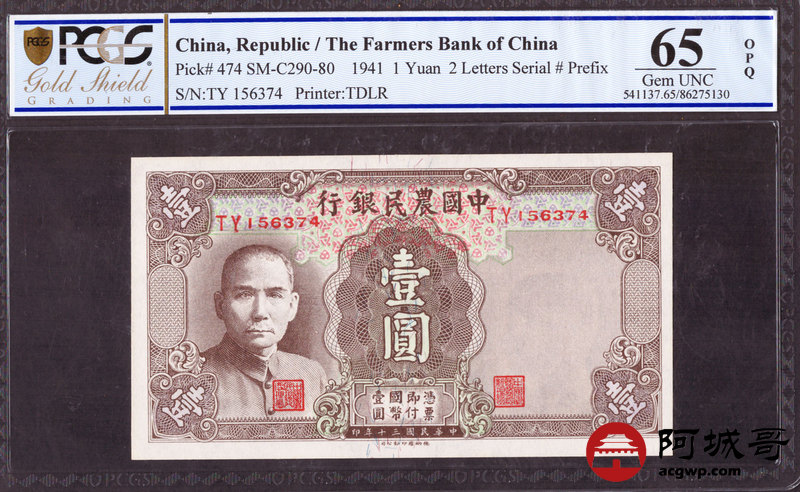 Lot:49 民国30年 中国农民银行 壹圆 PCGS 65OPQ