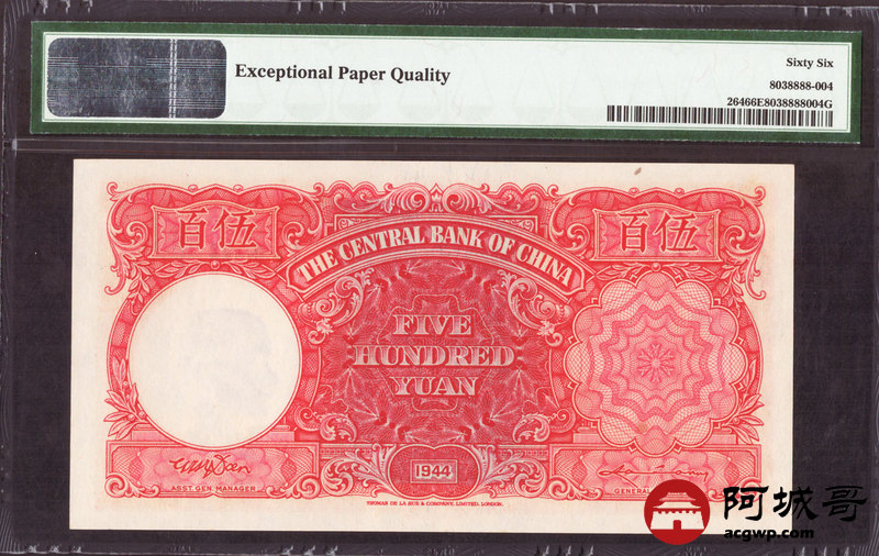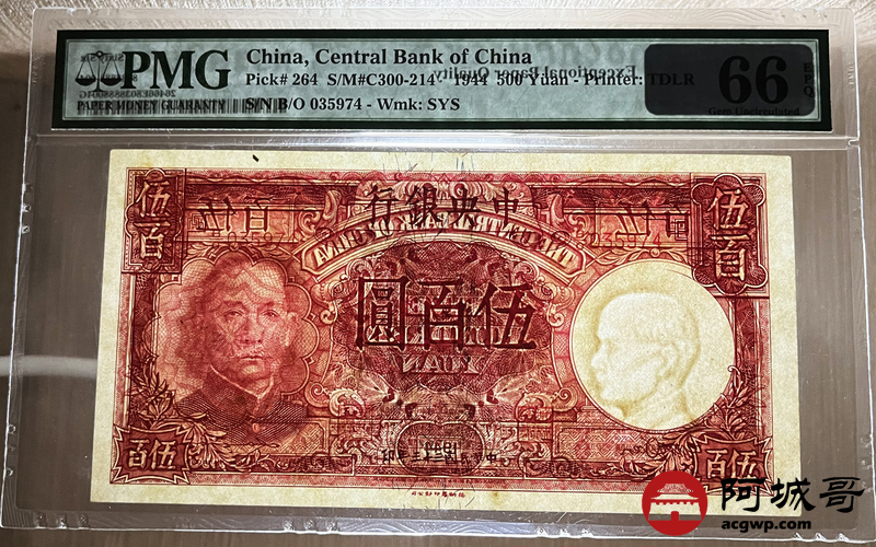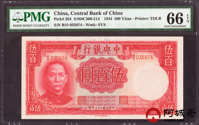 Lot:3 民国33年 中央银行 伍佰圆 PMG 66EPQ