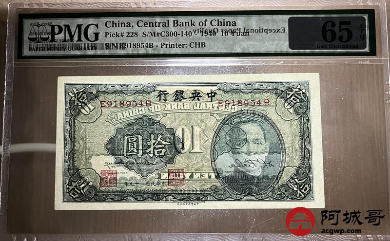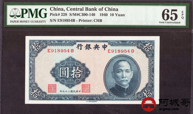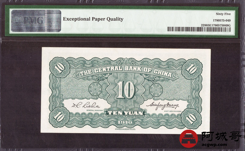 Lot:14 民国29年 中央银行 拾圆 PMG 65EPQ
