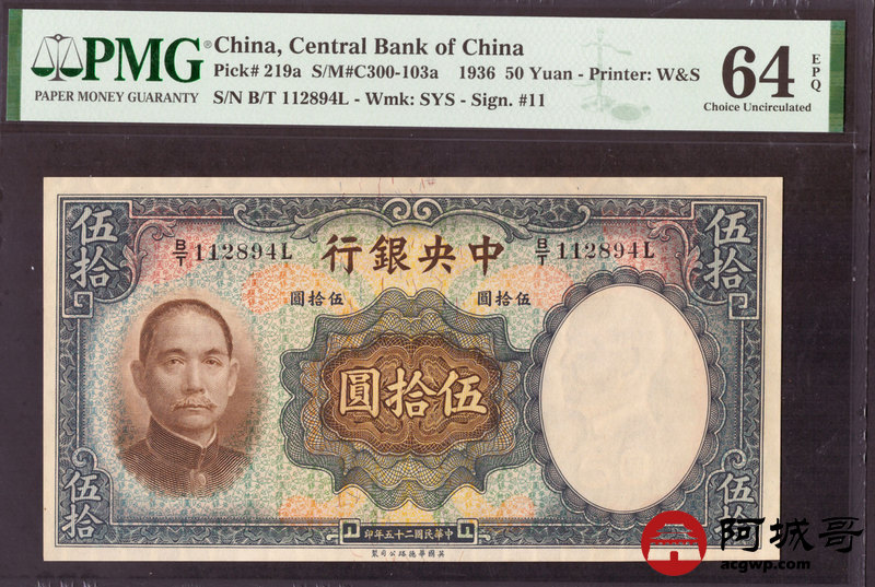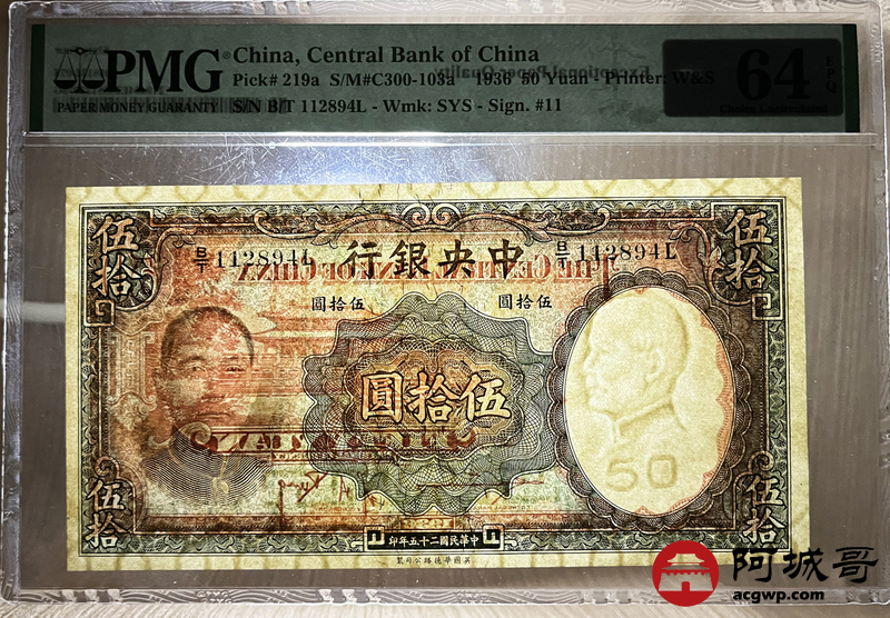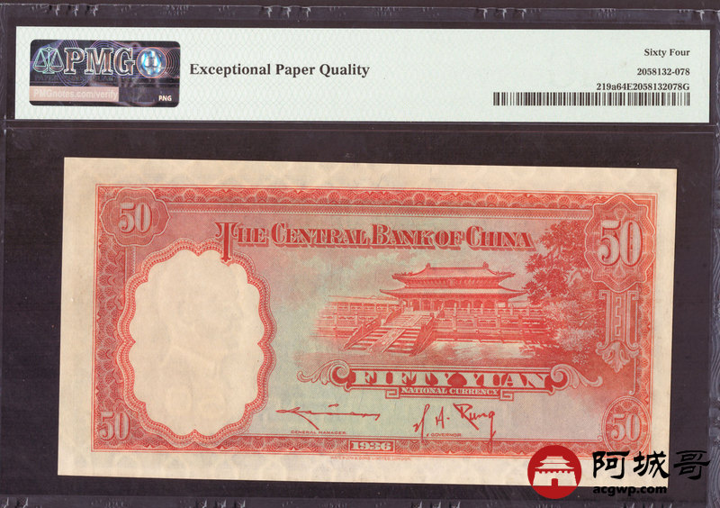 Lot:27 民国25年 中央银行 伍拾圆 PMG 64EPQ