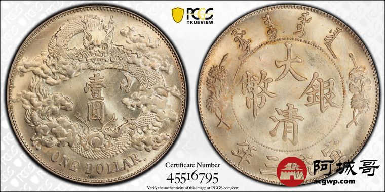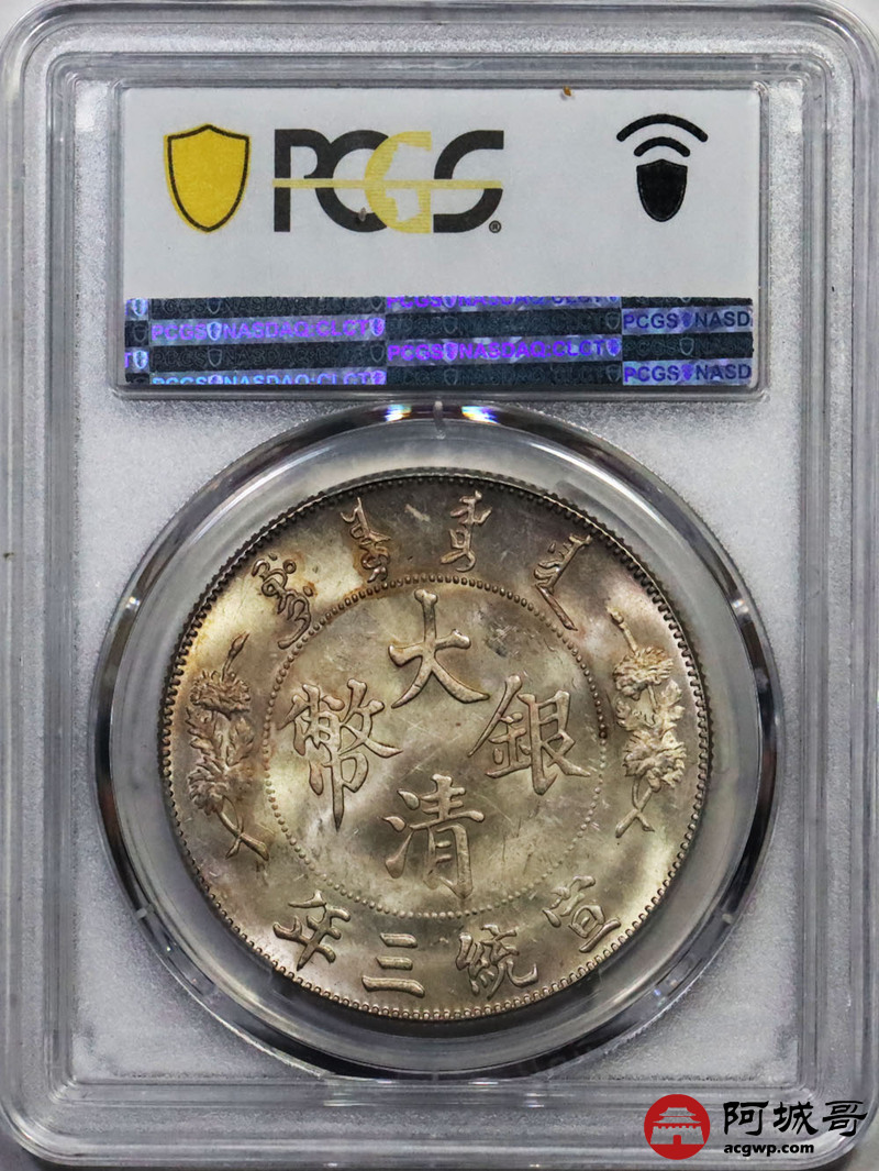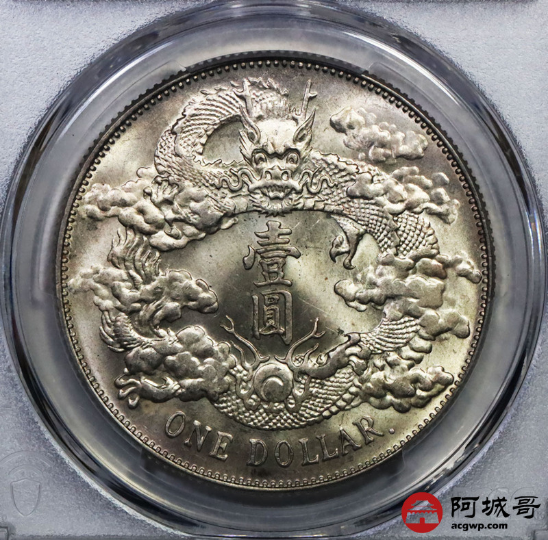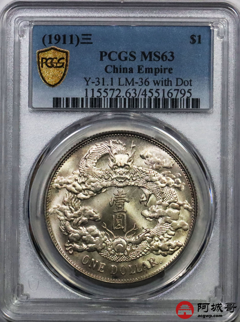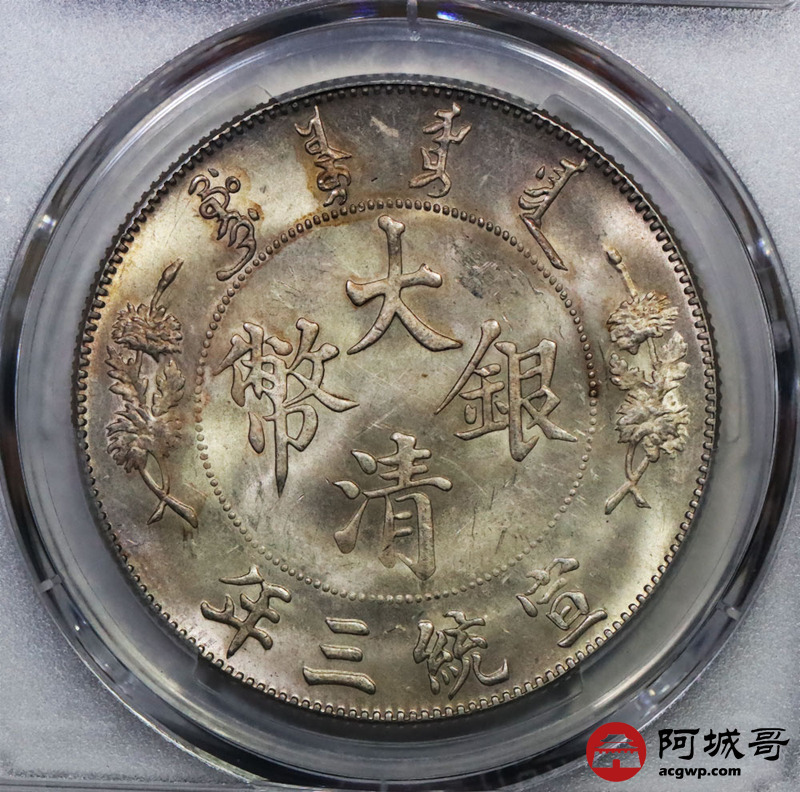 Lot:2 黄油转光 大清宣三壹圆 带点版 PCGS MS63