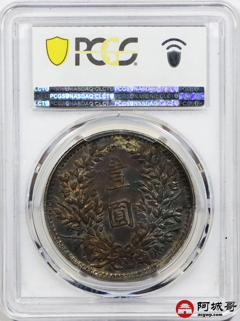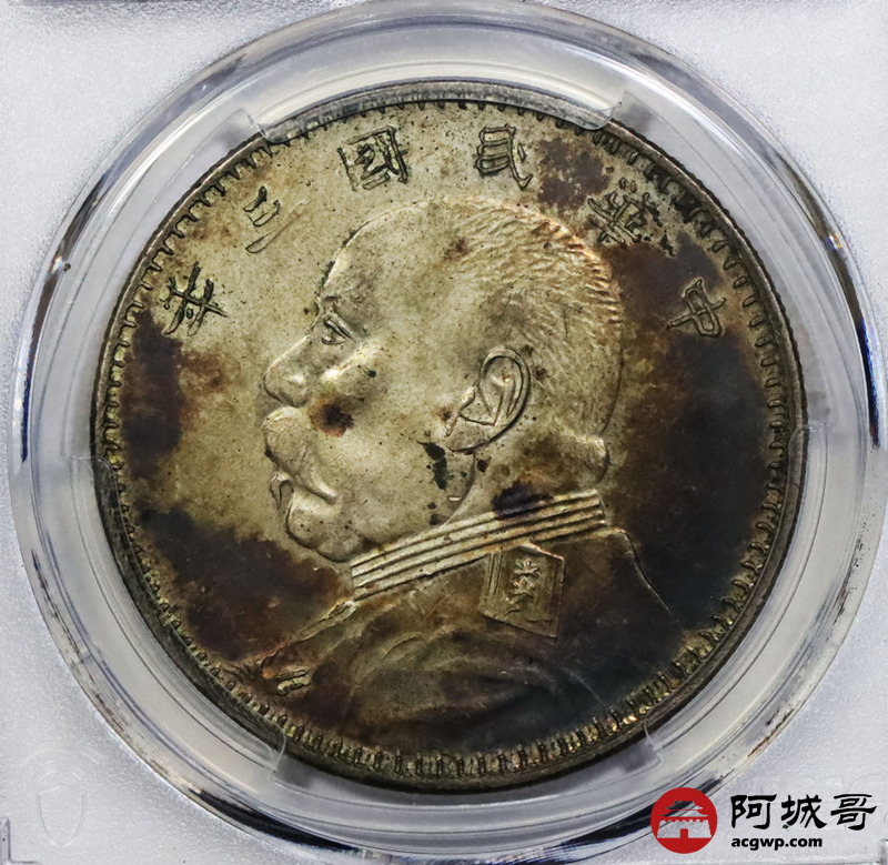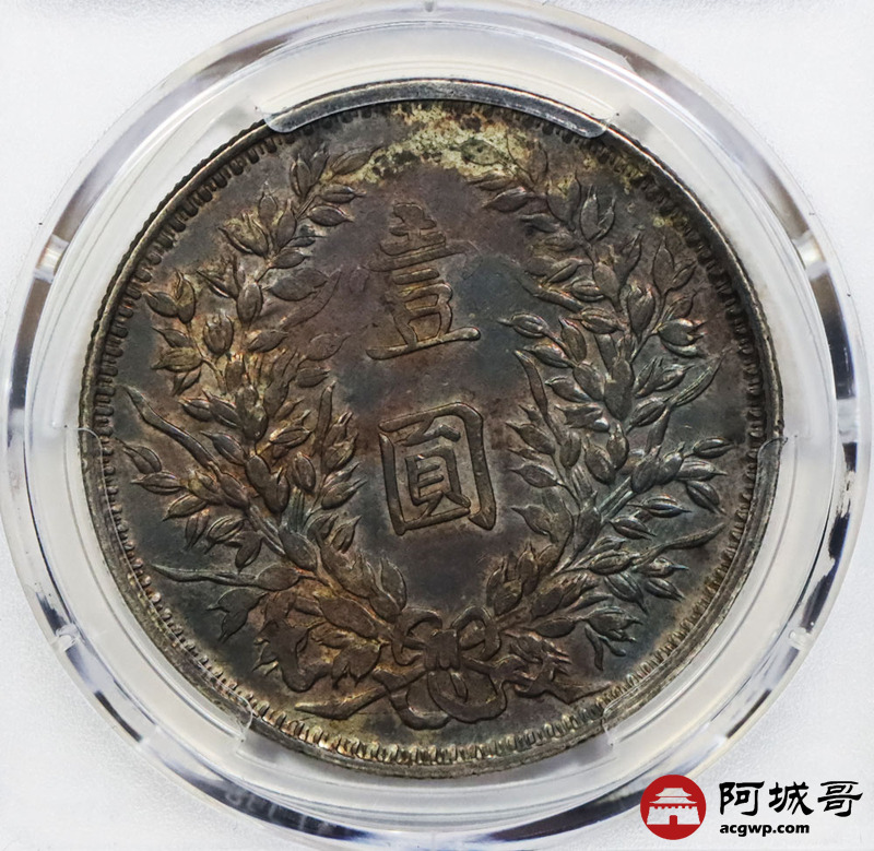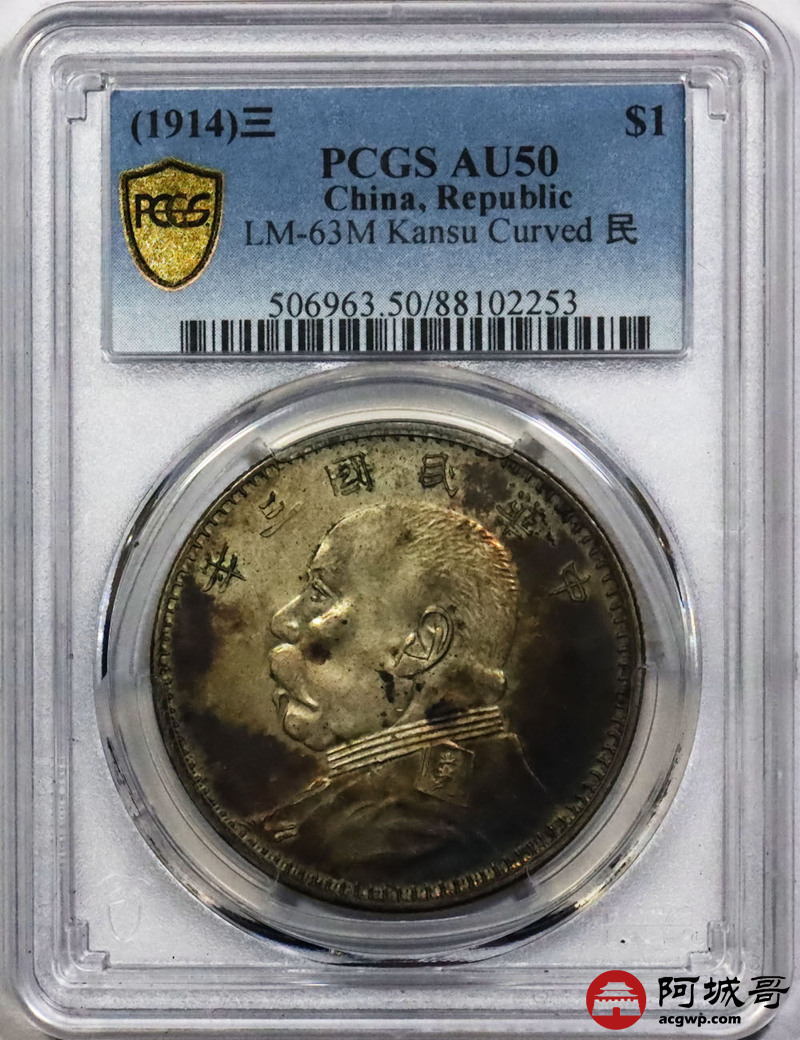 Lot:null 民国三年袁世凯像壹圆银币 甘肃曲笔民版 酱红色包浆 PCGS AU50 评级编号:88102253
