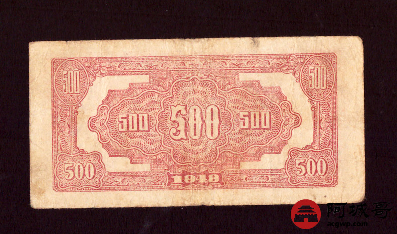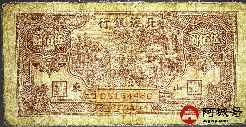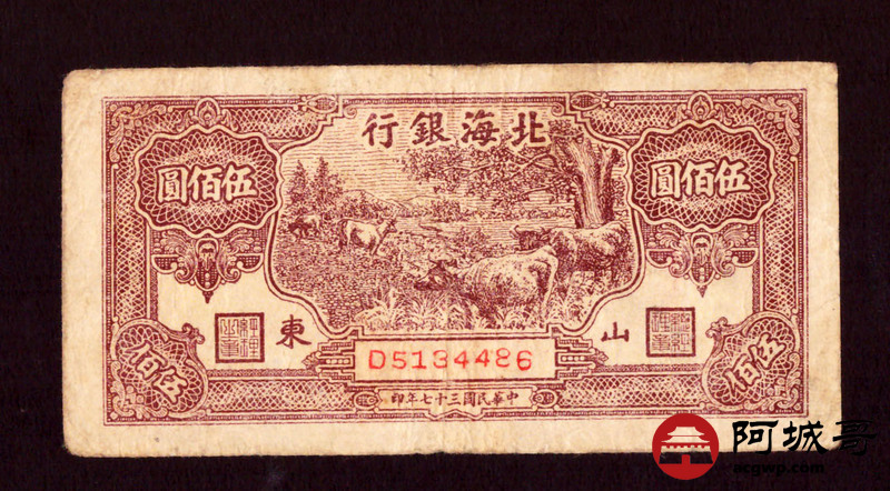 Lot:3 民国37年 北海银行 伍佰圆 山东地名 69至7成新