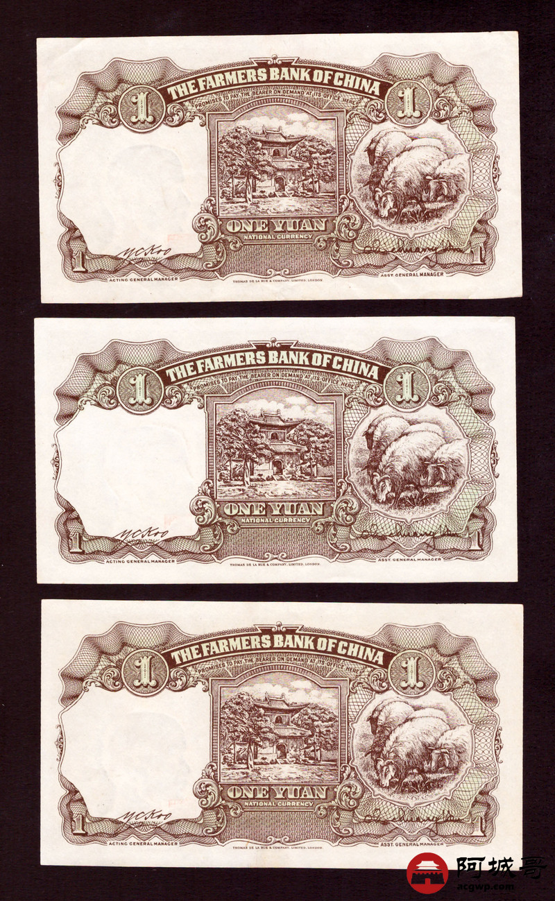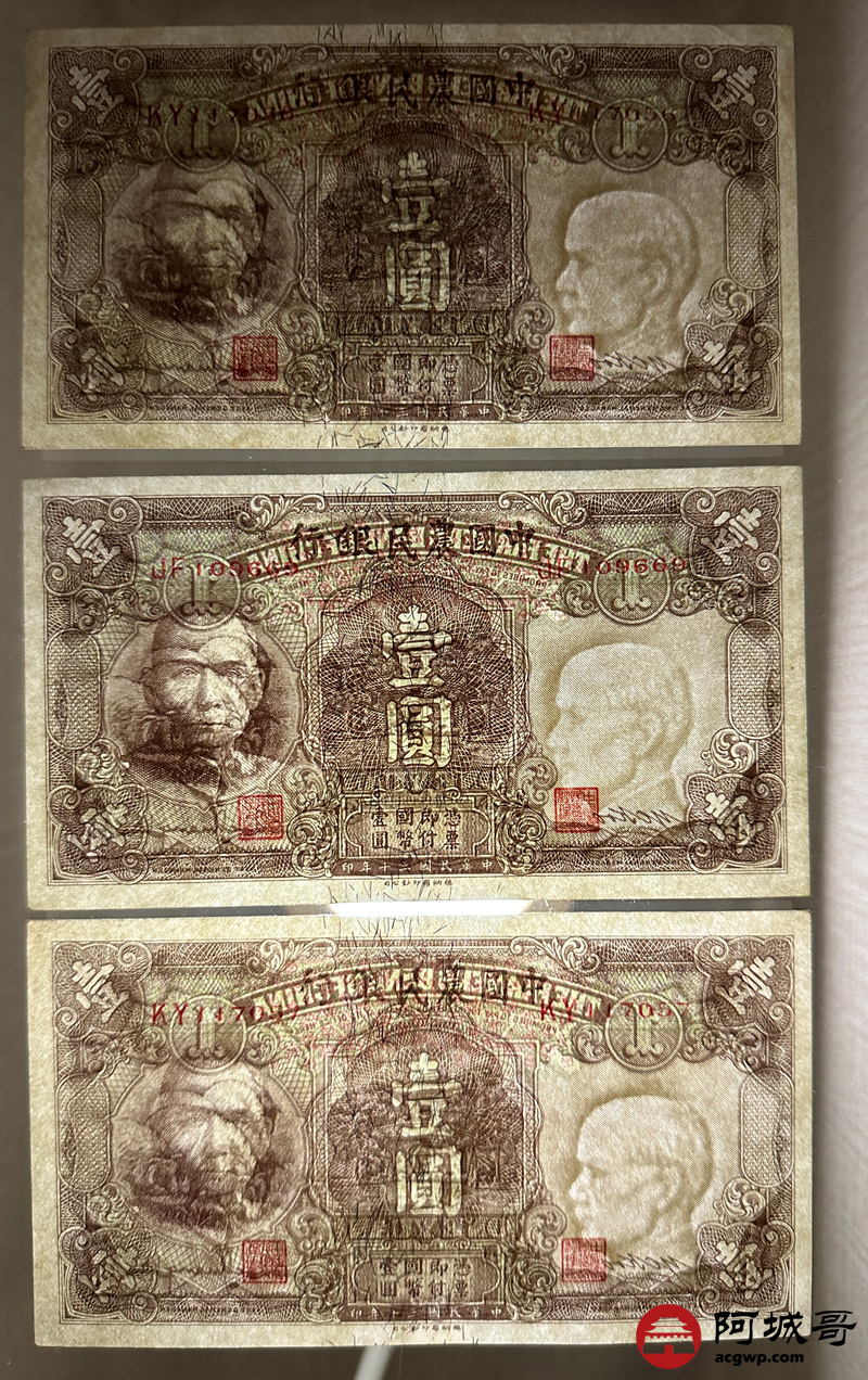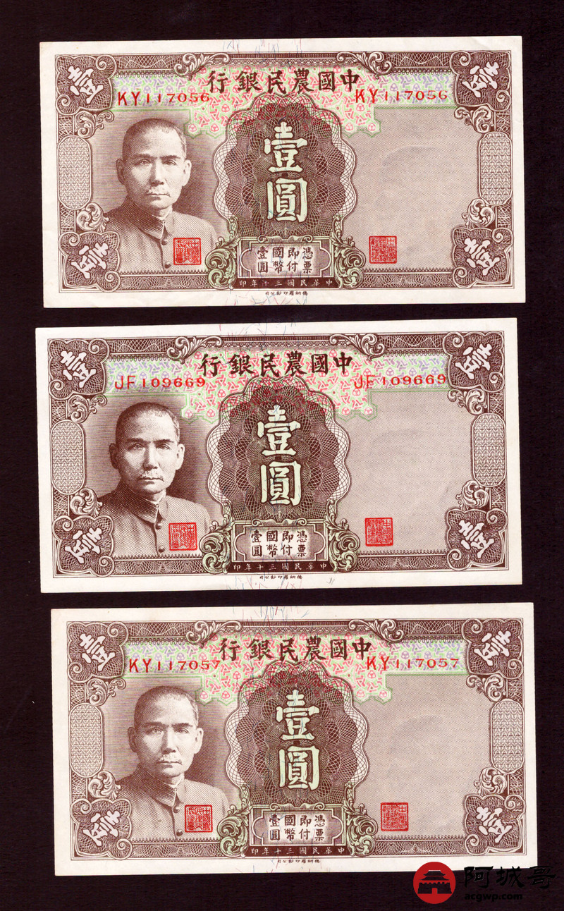 Lot:1 民国30年 中国农民银行 壹圆 3张一组 从上至下92成新、93成新、93成新