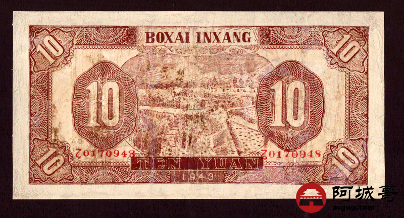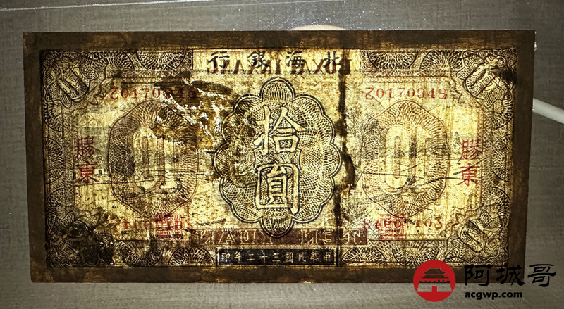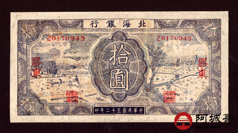 Lot:22 民国32年 北海银行 拾圆 胶东地名 大面积修补 45成新