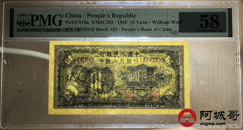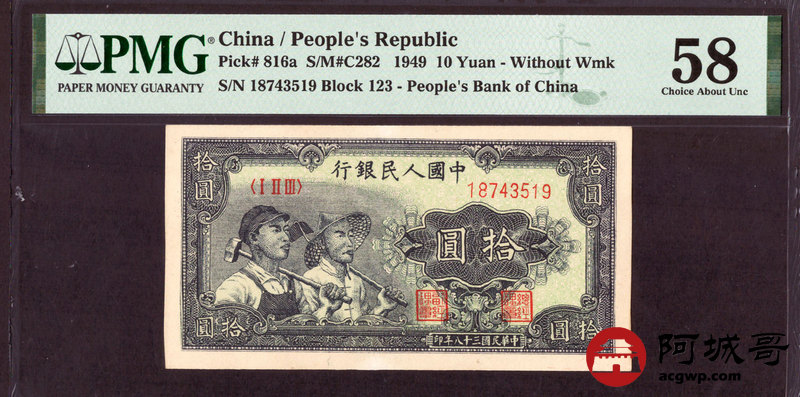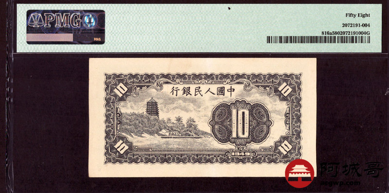 Lot:16 一版 民国38年 拾圆 工农 PMG 58