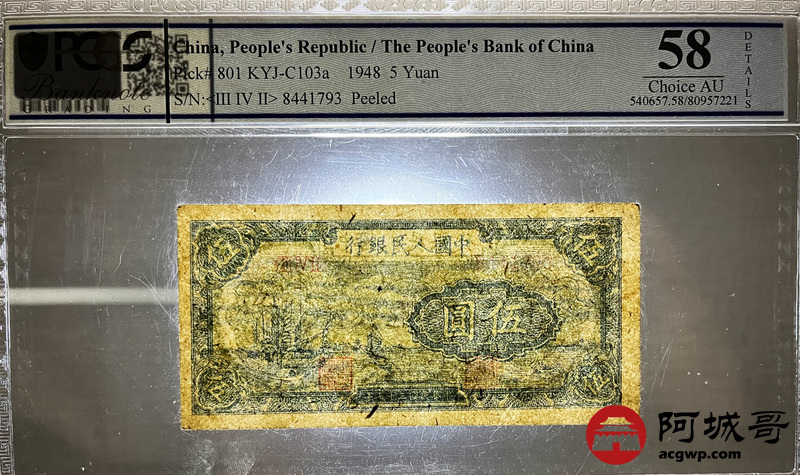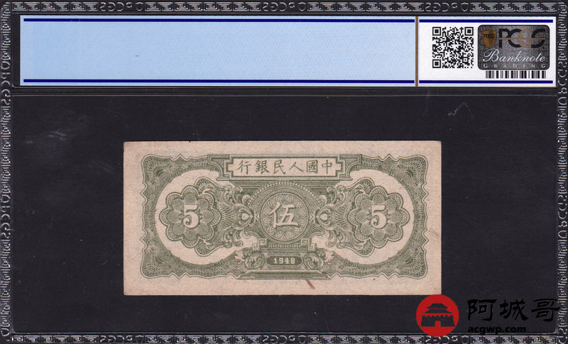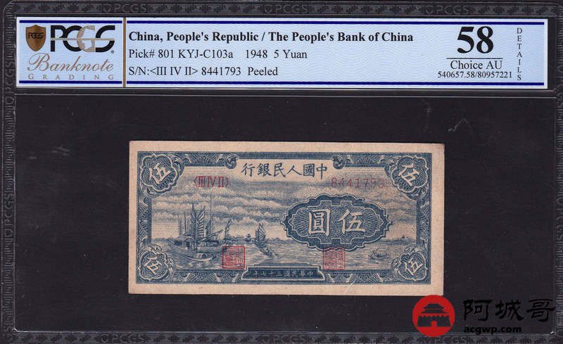 Lot:23 一版 民国37年 五圆小帆船 中国人民银行 PCGS 58