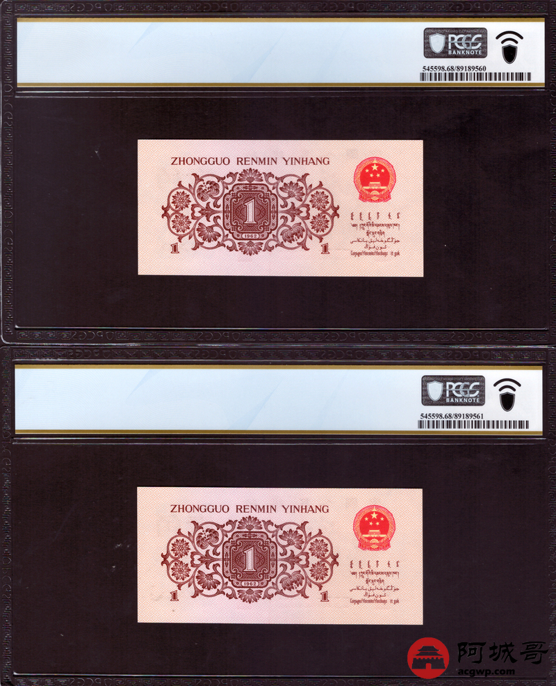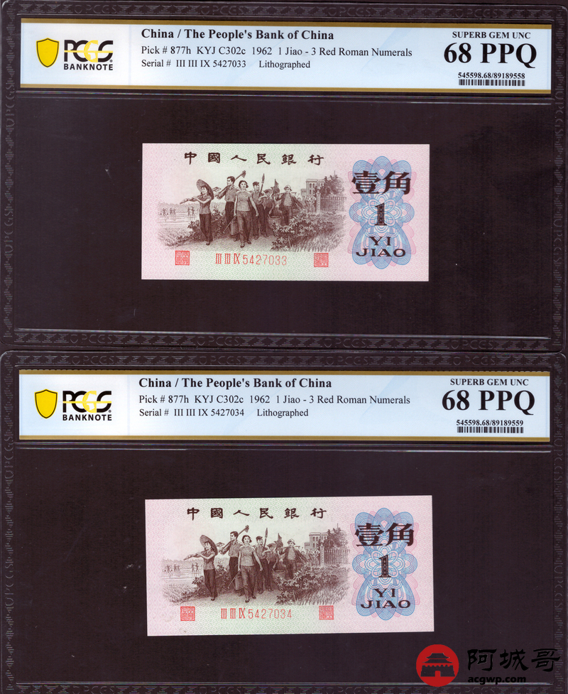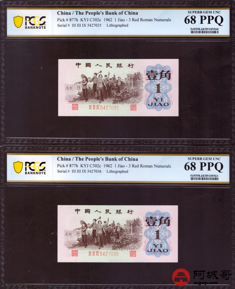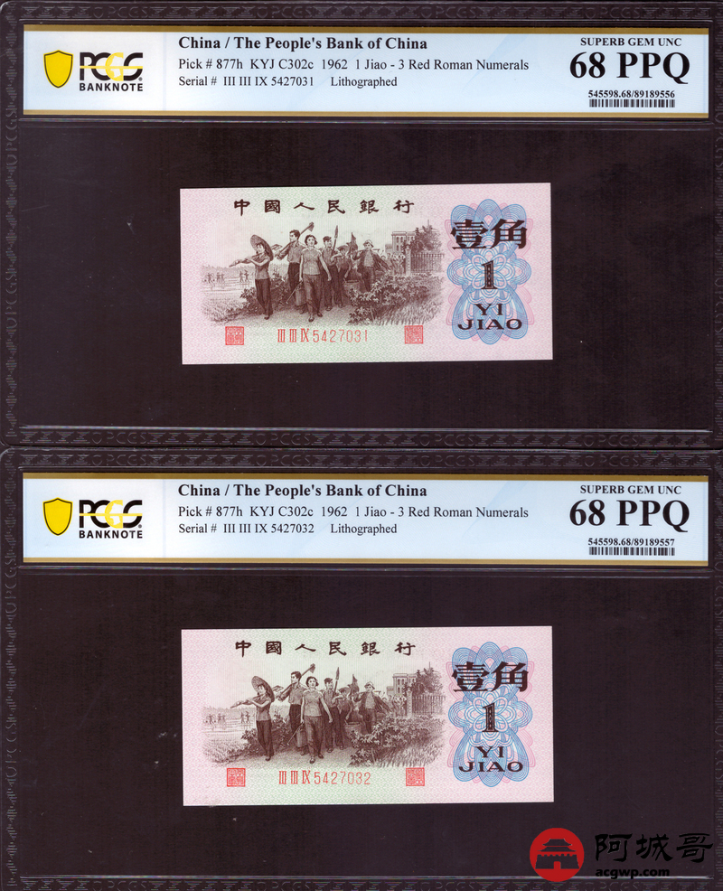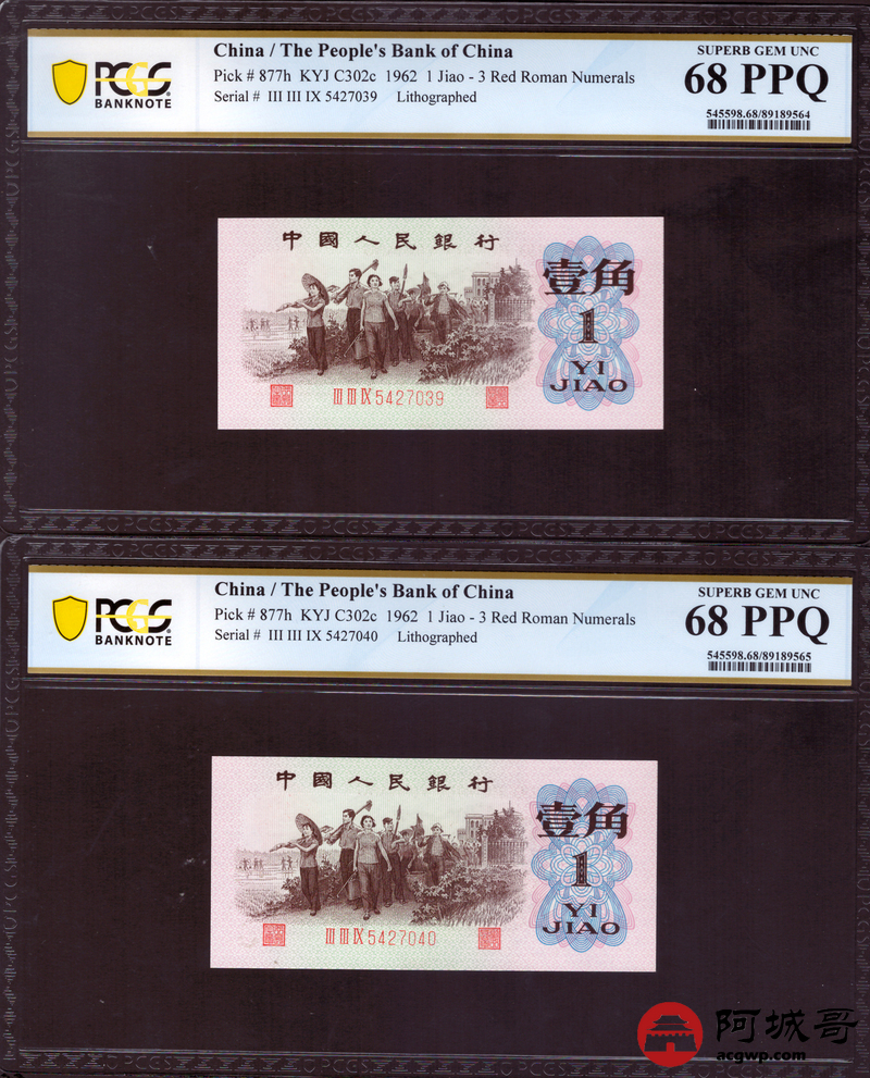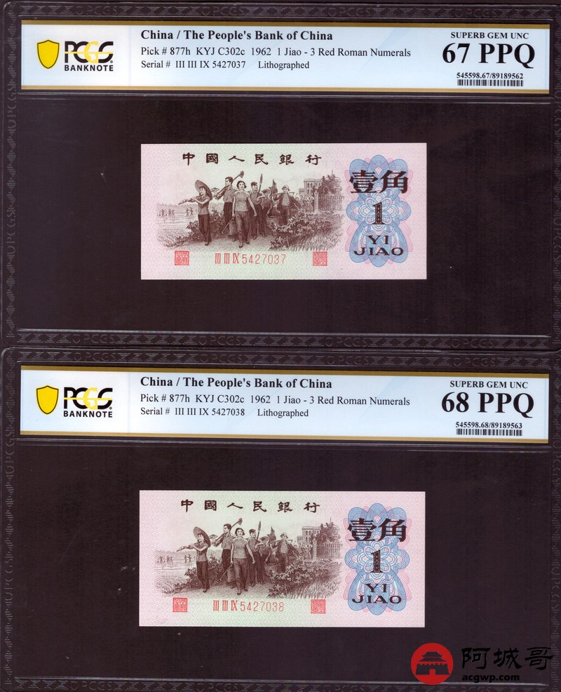 Lot:22 三版 1962年 平版壹角 PCGS 67-68PPQ 十枚一组连号