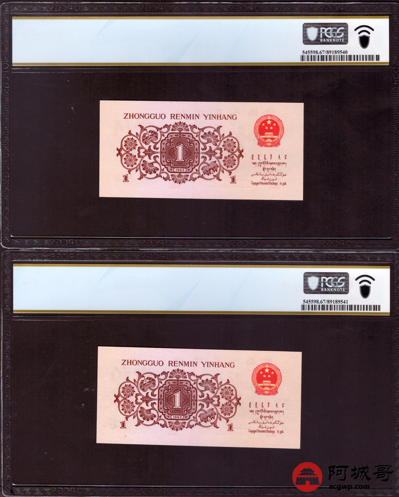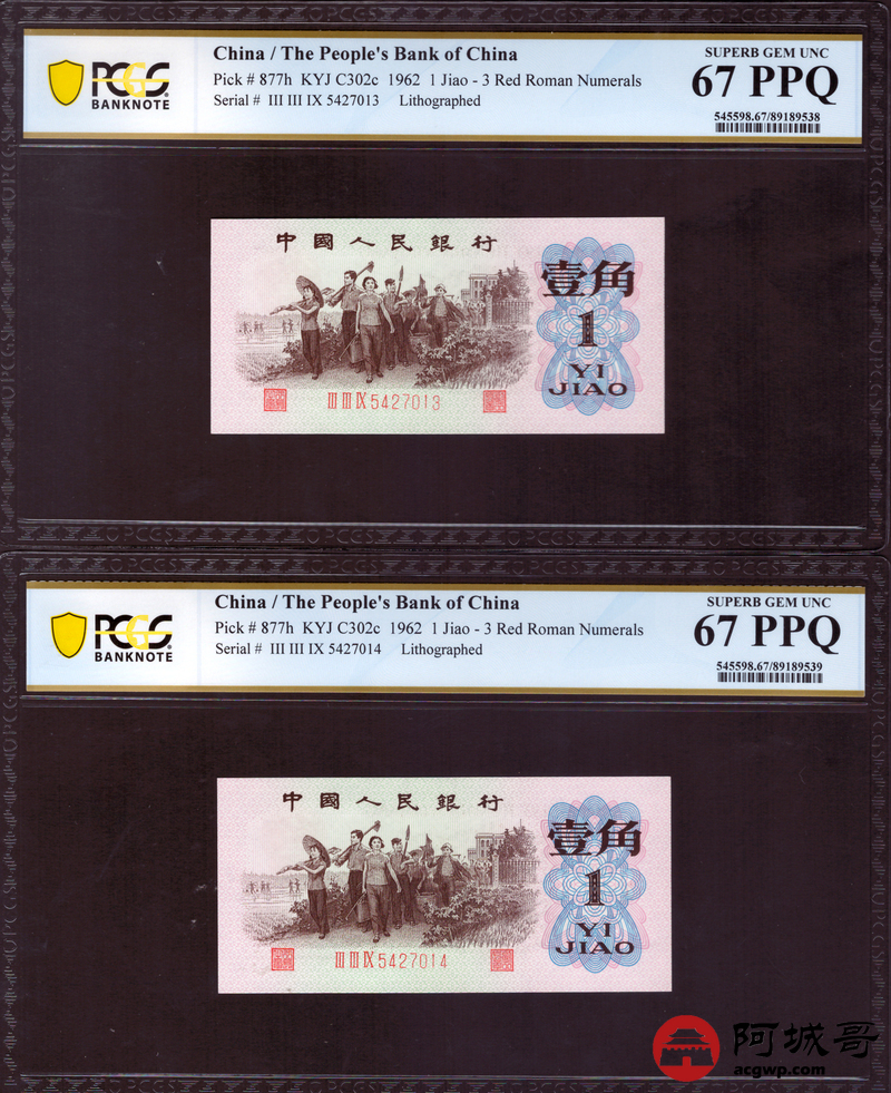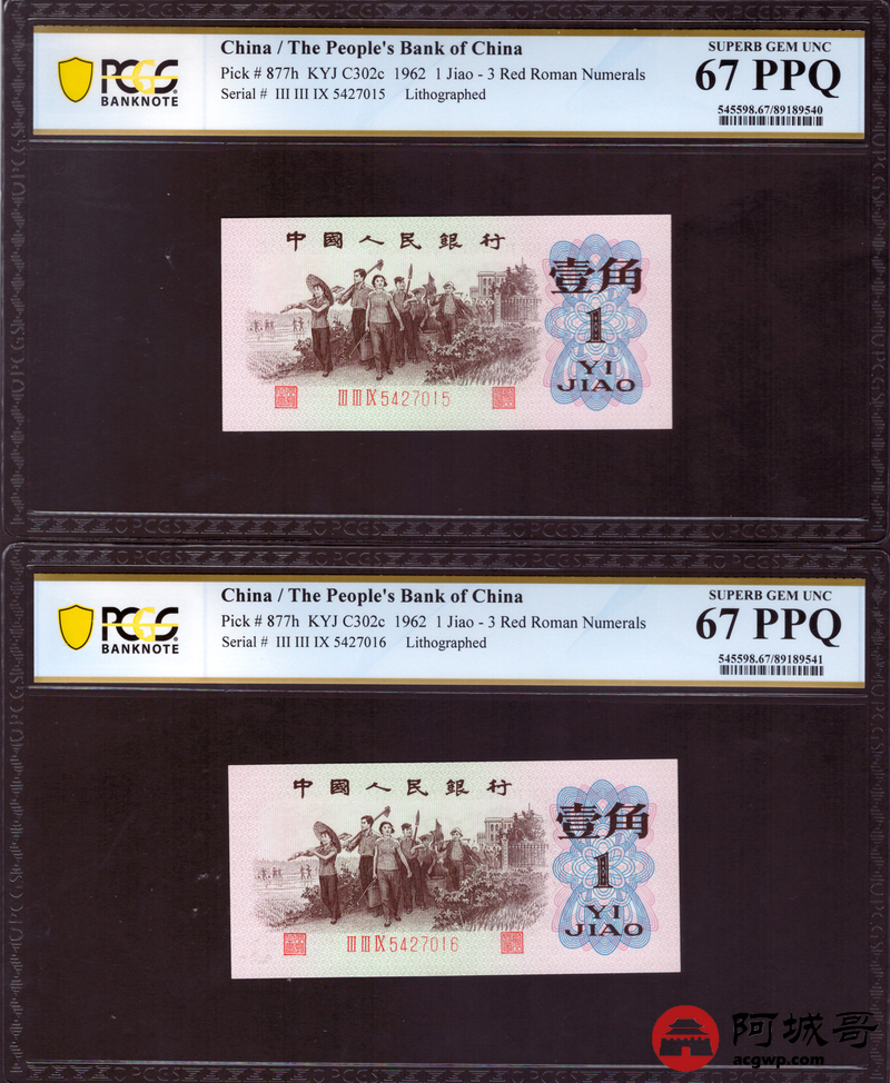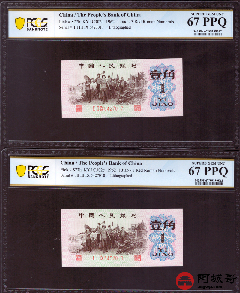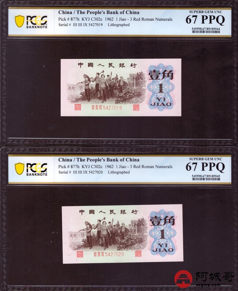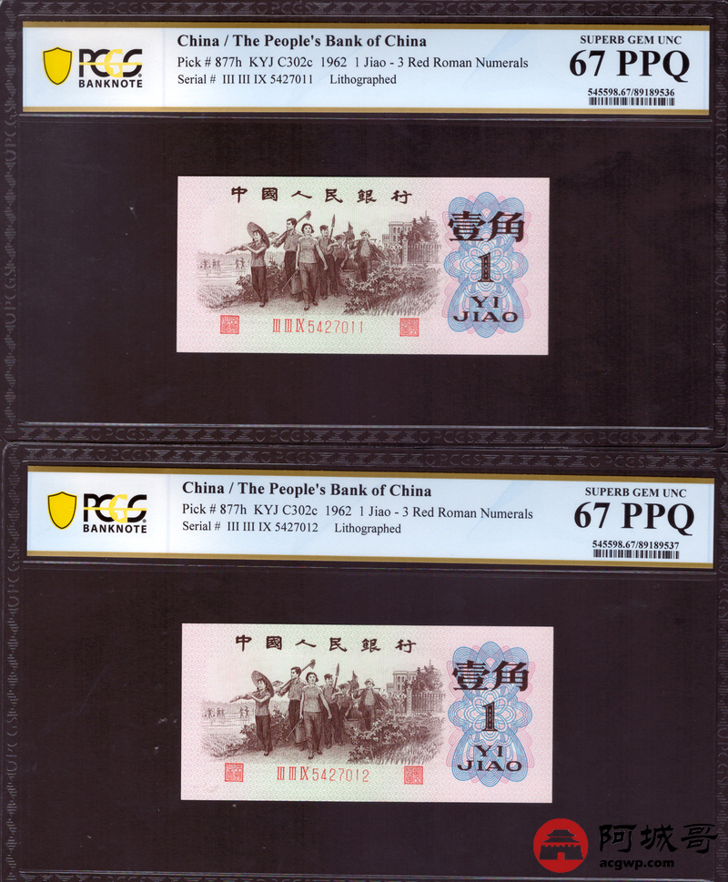 Lot:1 三版 1962年 平版壹角 PCGS 67PPQ 十枚一组连号