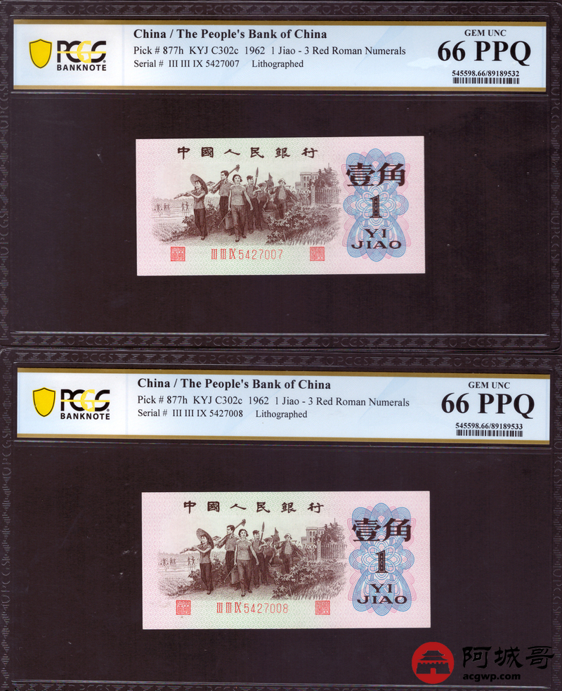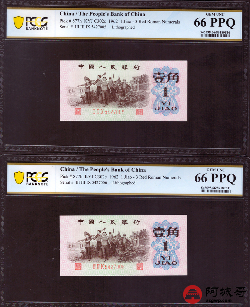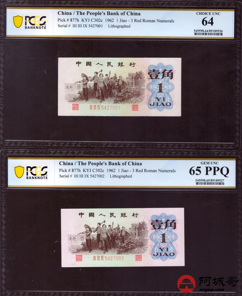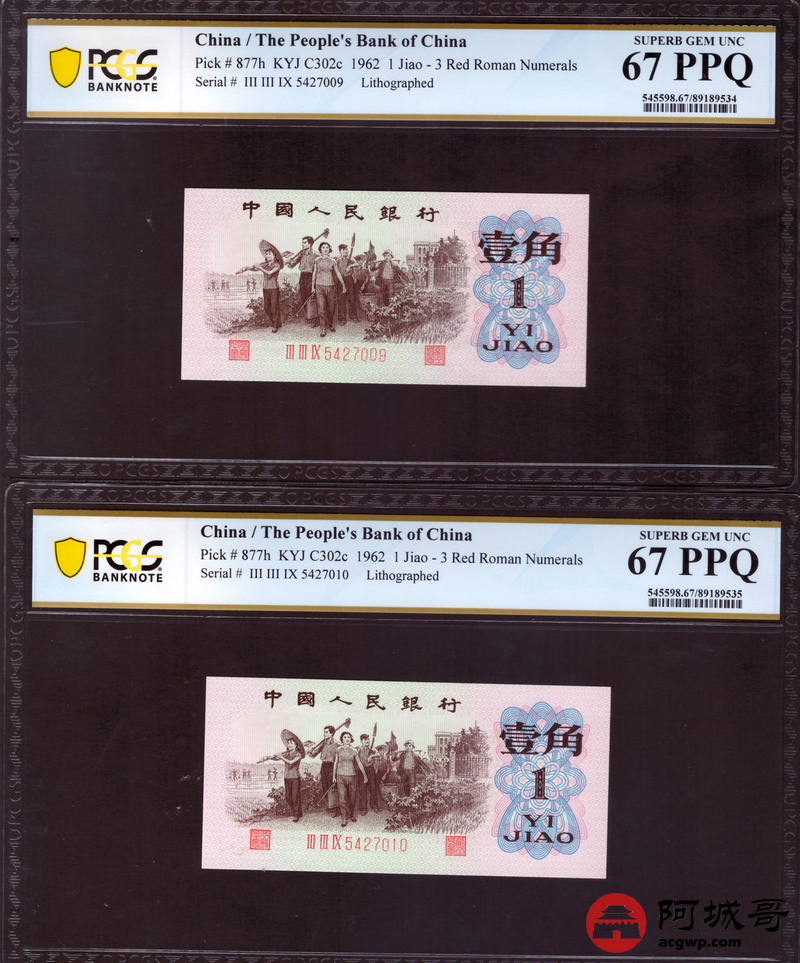 Lot:18 三版 1962年 平版壹角 PCGS 64-65-66-67PPQ 十枚一组连号