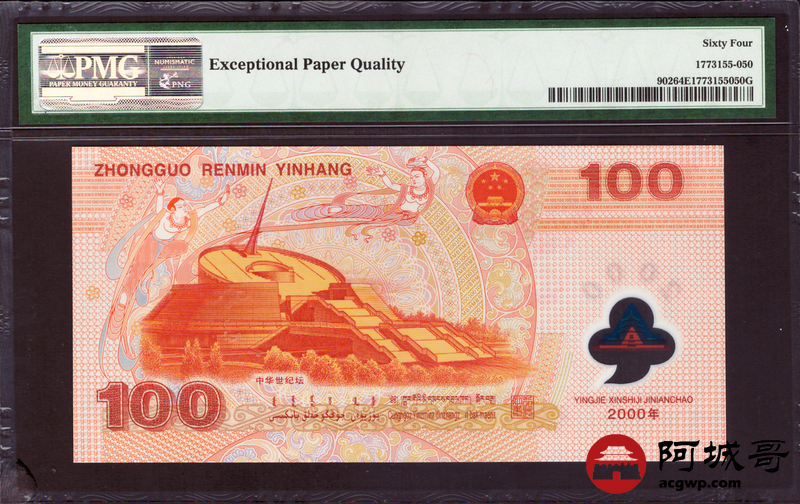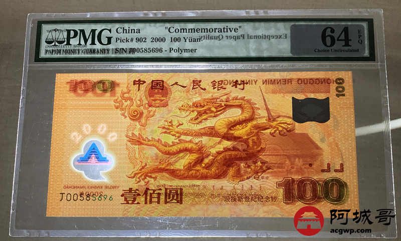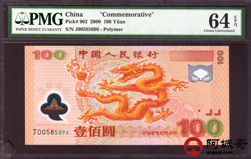 Lot:20 2000年 龙钞纪念币壹佰圆 PMG 64EPQ 好号无347