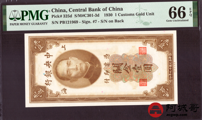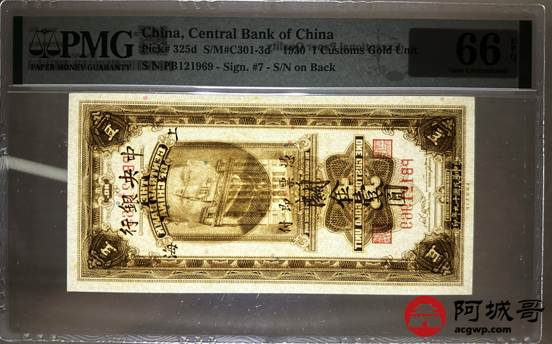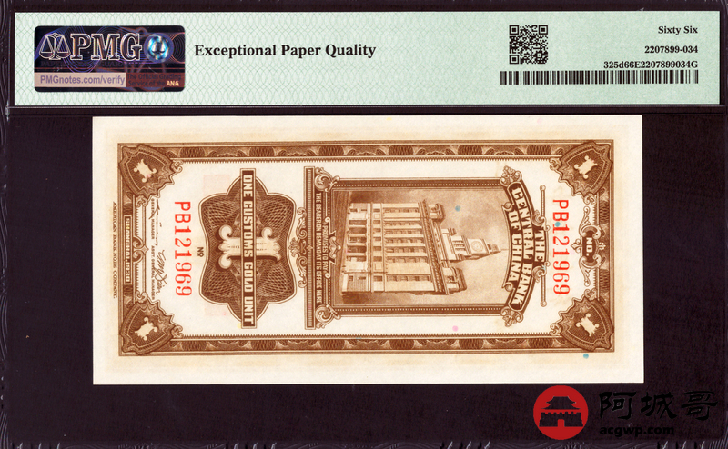 Lot:13 民国19年 中央银行 关金壹圆 上海地名 PMG 66EPQ 朦胧号