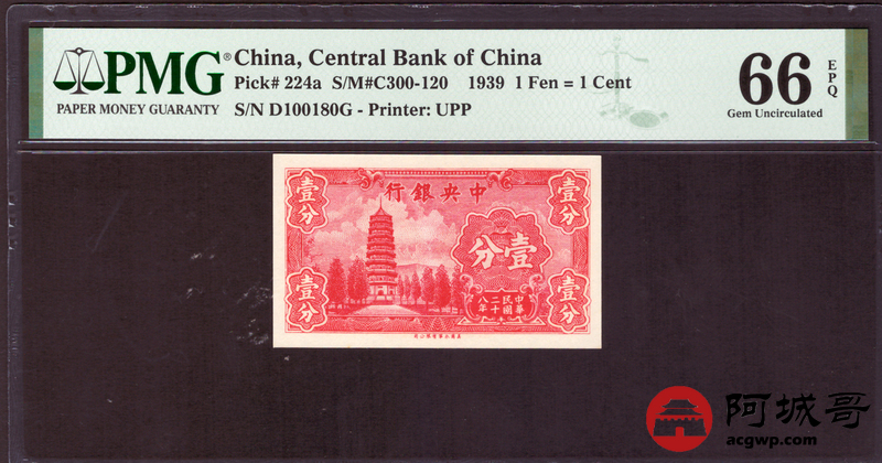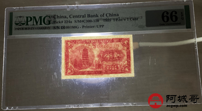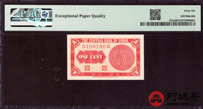 Lot:21 民国28年 中央银行 壹分 PMG 66EPQ 倒置号、数三号
