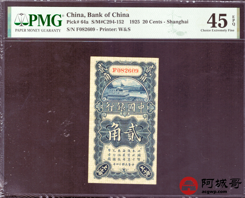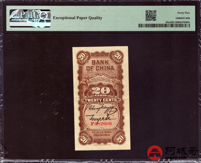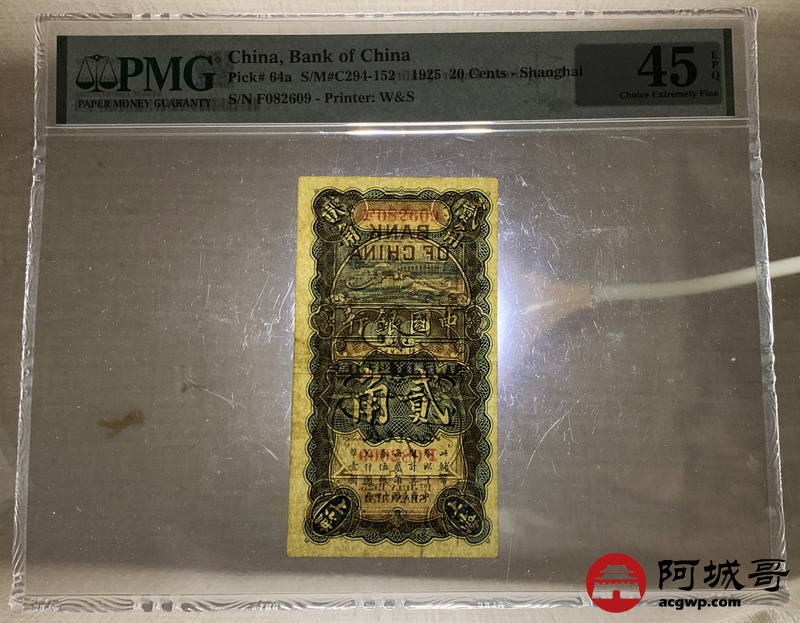 Lot:4 民国14年 中国银行 贰角 上海地名 PMG 45EPQ 朦胧号