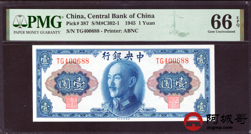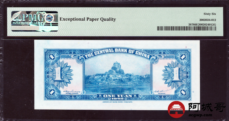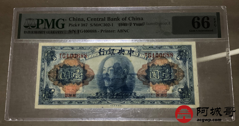 Lot:3 1945年 中央银行 壹圆 PMG 66EPQ