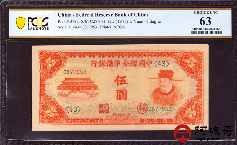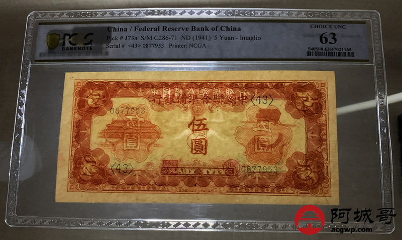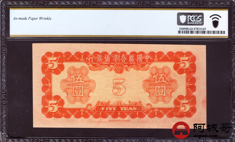 Lot:21 中国联合准备银行 伍圆 PCGS 63