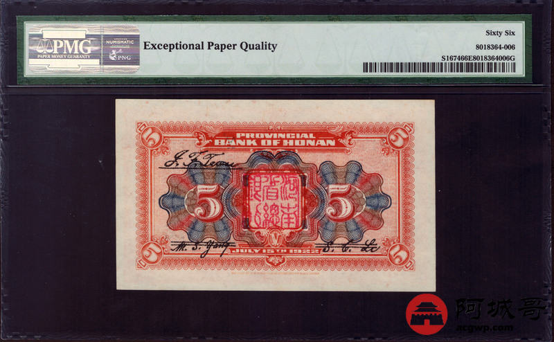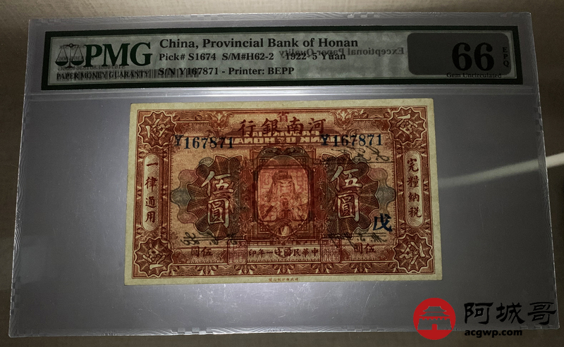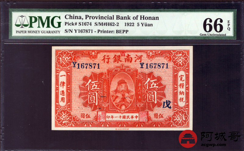 Lot:15 民国11年 河南省银行 伍圆 PMG 66EPQ 冠军分