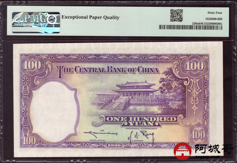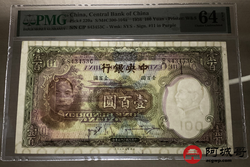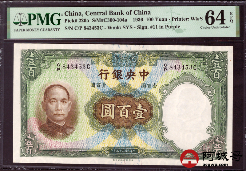 Lot:30 民国25年 中央银行 壹佰圆 PMG 64EPQ