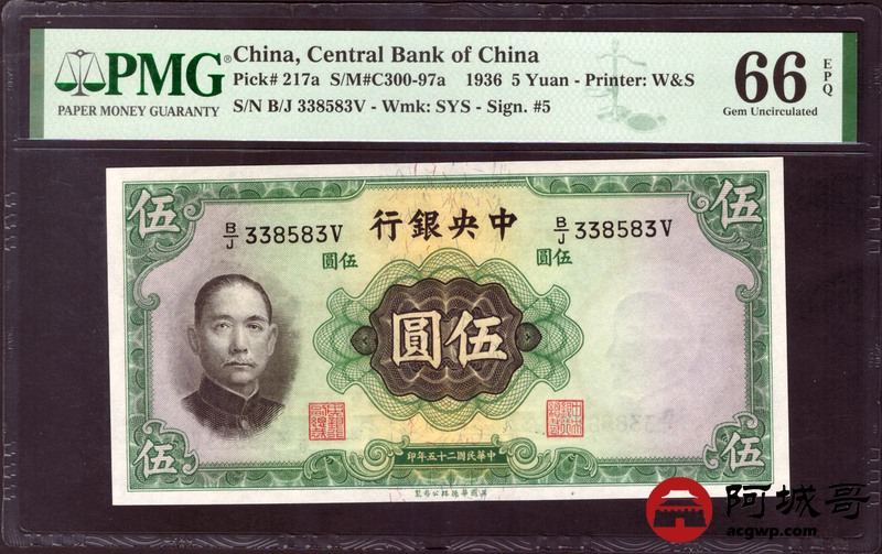 Lot:2 民国25年 中央银行 伍圆 PMG 66EPQ 数三号