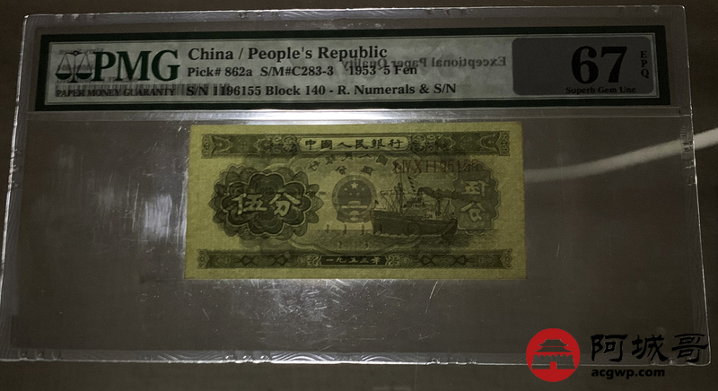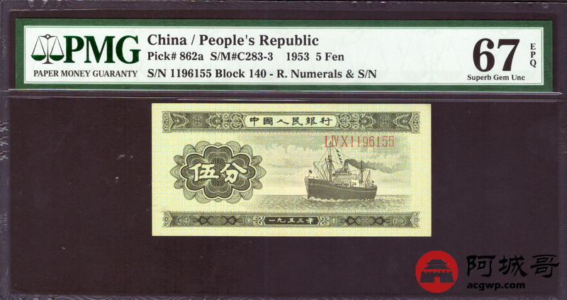 Lot:19 二版 1953年 轮船伍分 无47 PMG 67EPQ