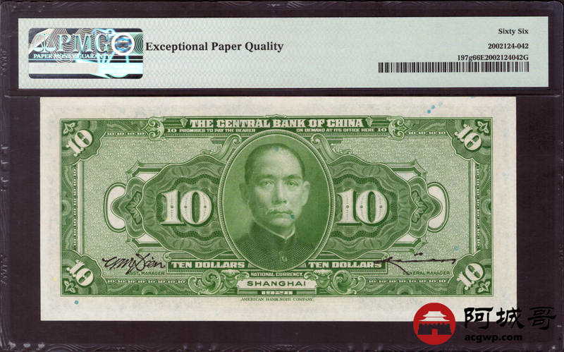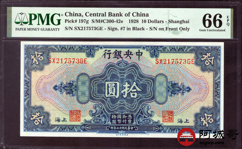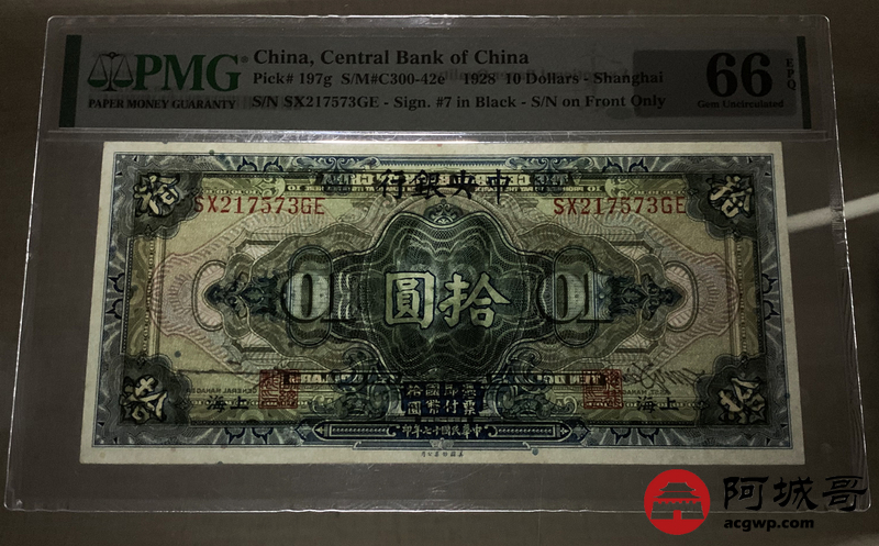 Lot:26 民国17年 中央银行 拾圆 无4 PMG 66EPQ
