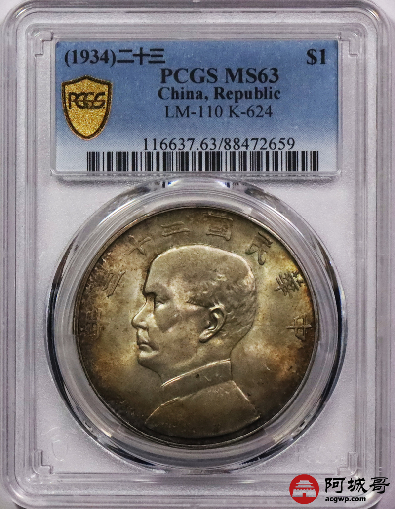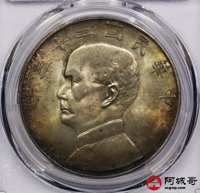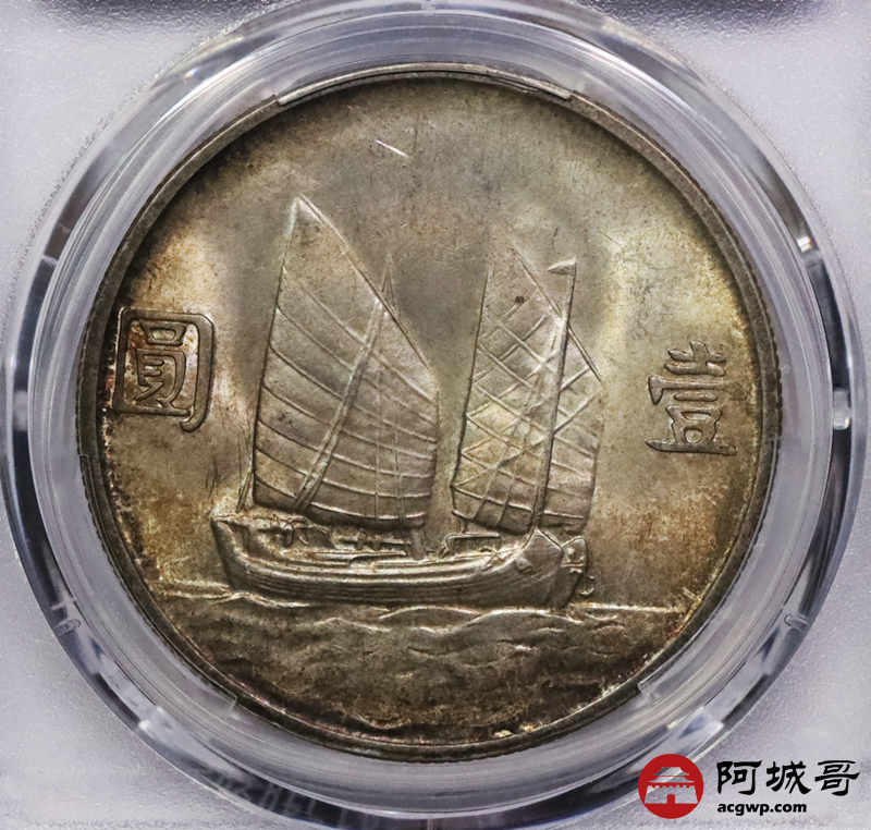 Lot:3211 1934民国二十三年孙中山像背帆船壹圆银币一枚,黄油转光,五彩包浆PCGS MS63评级编号:88472659
