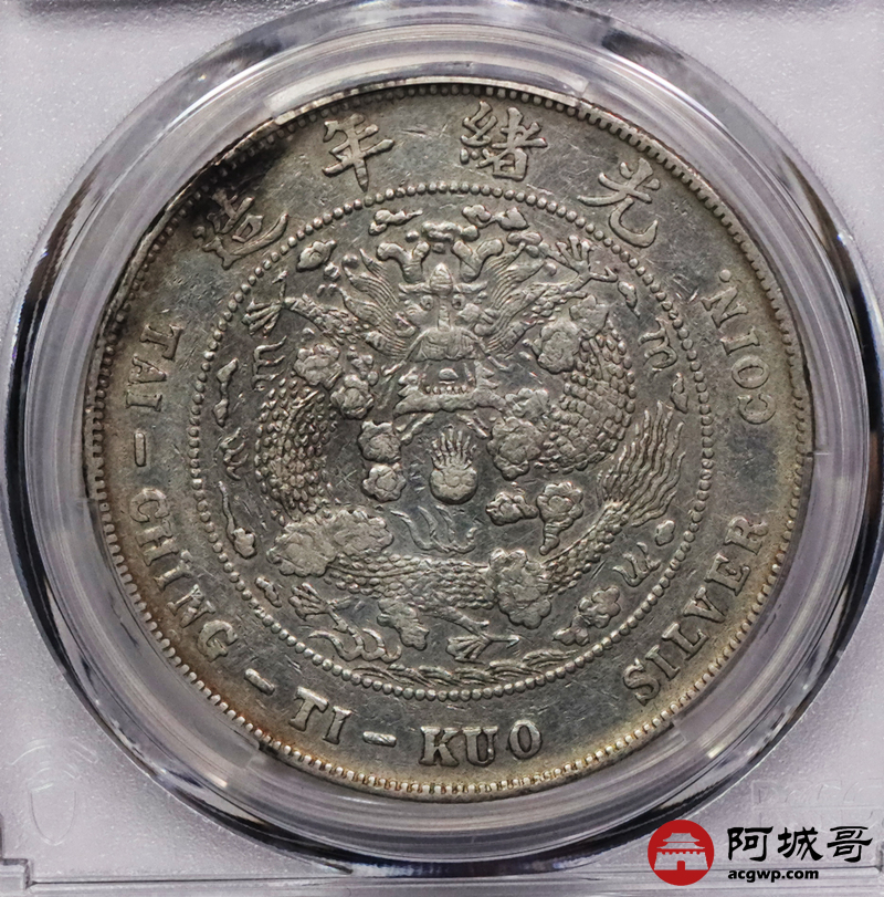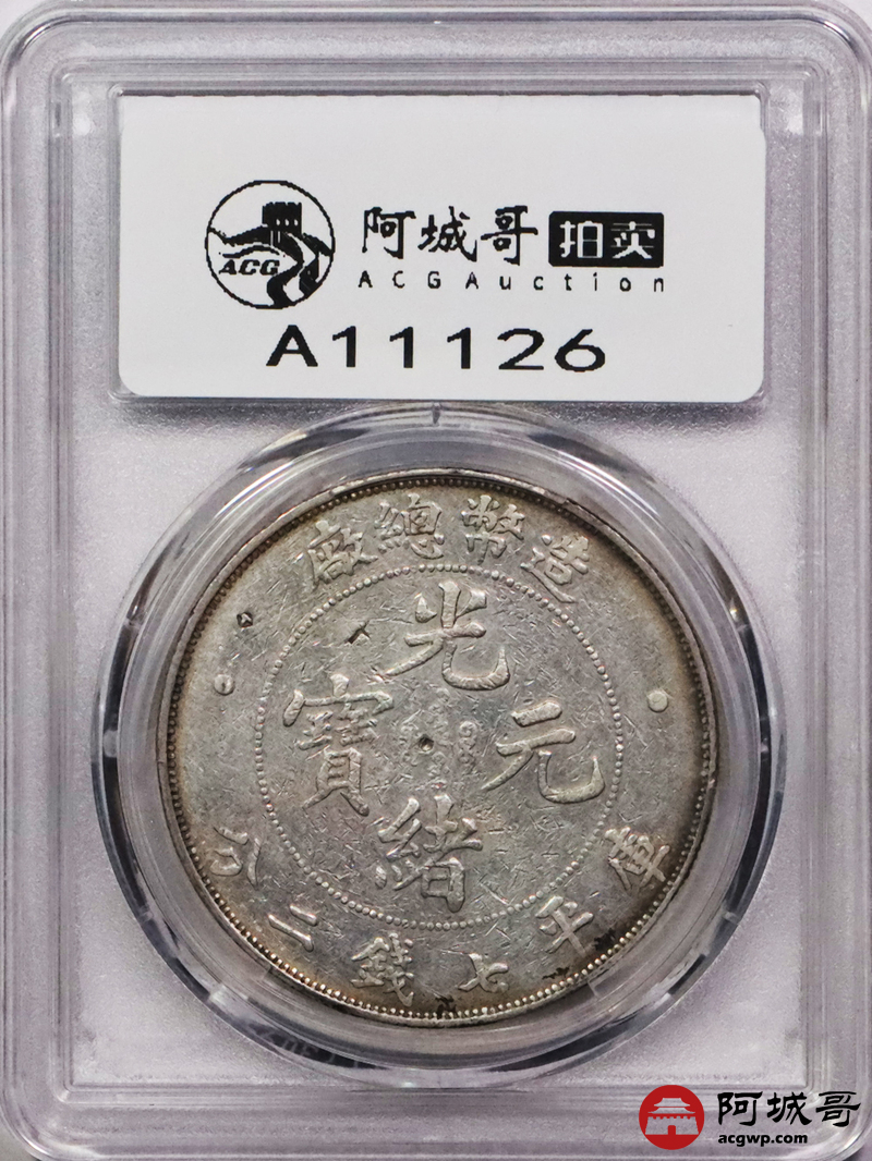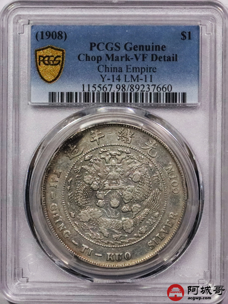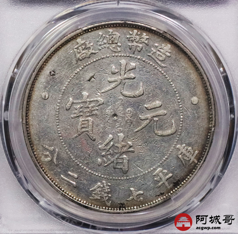 Lot:3022 1908光绪年造造币总厂光绪元宝库平七钱二分银币一枚,淡黄油底板 PCGS VF