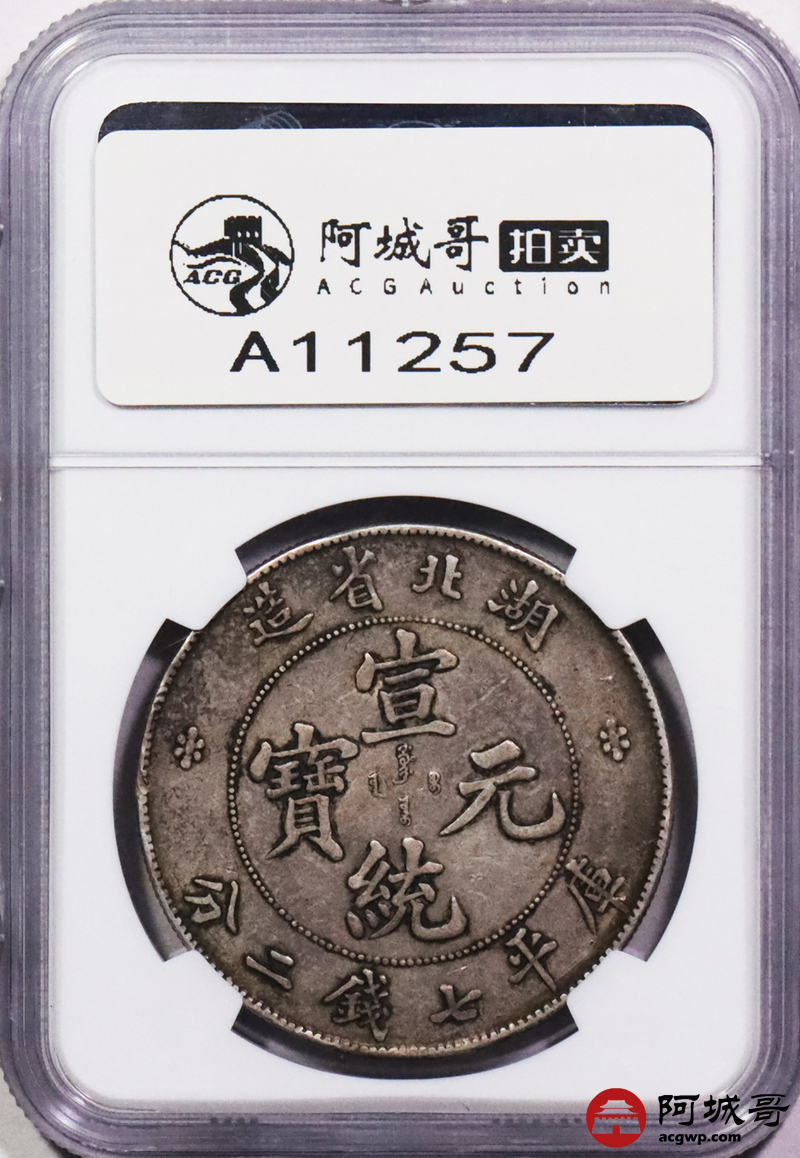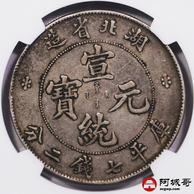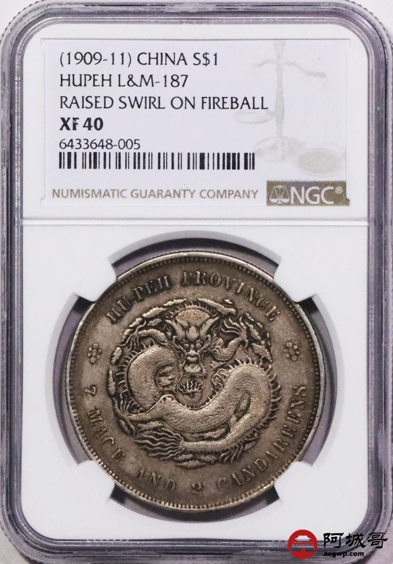 Lot:3079 1909-11湖北省造宣统元宝库平七钱二分银币一枚,原汁原味NGC XF40评级编号:6433648-005