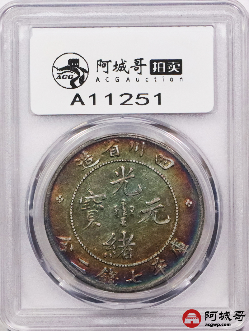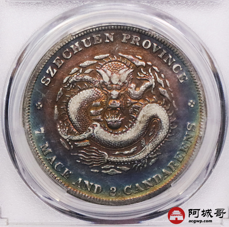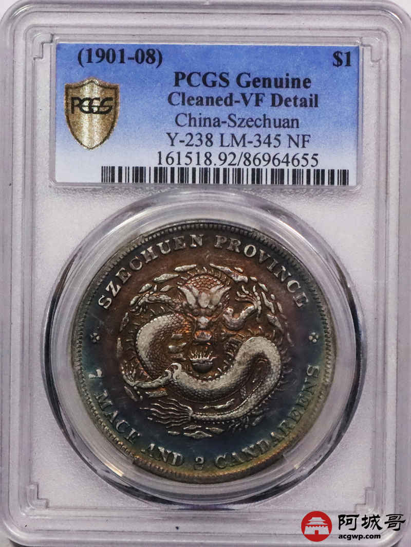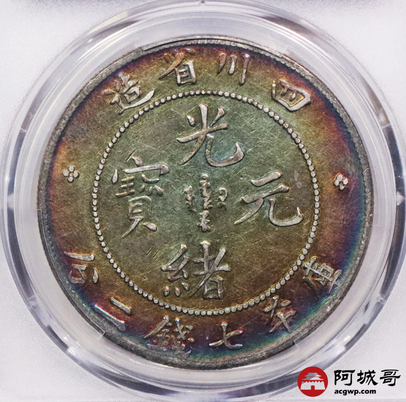 Lot:3403 1901-08四川省造光绪元宝库平七钱二分银币一枚,五彩包浆PCGS VF评级编号:86964655