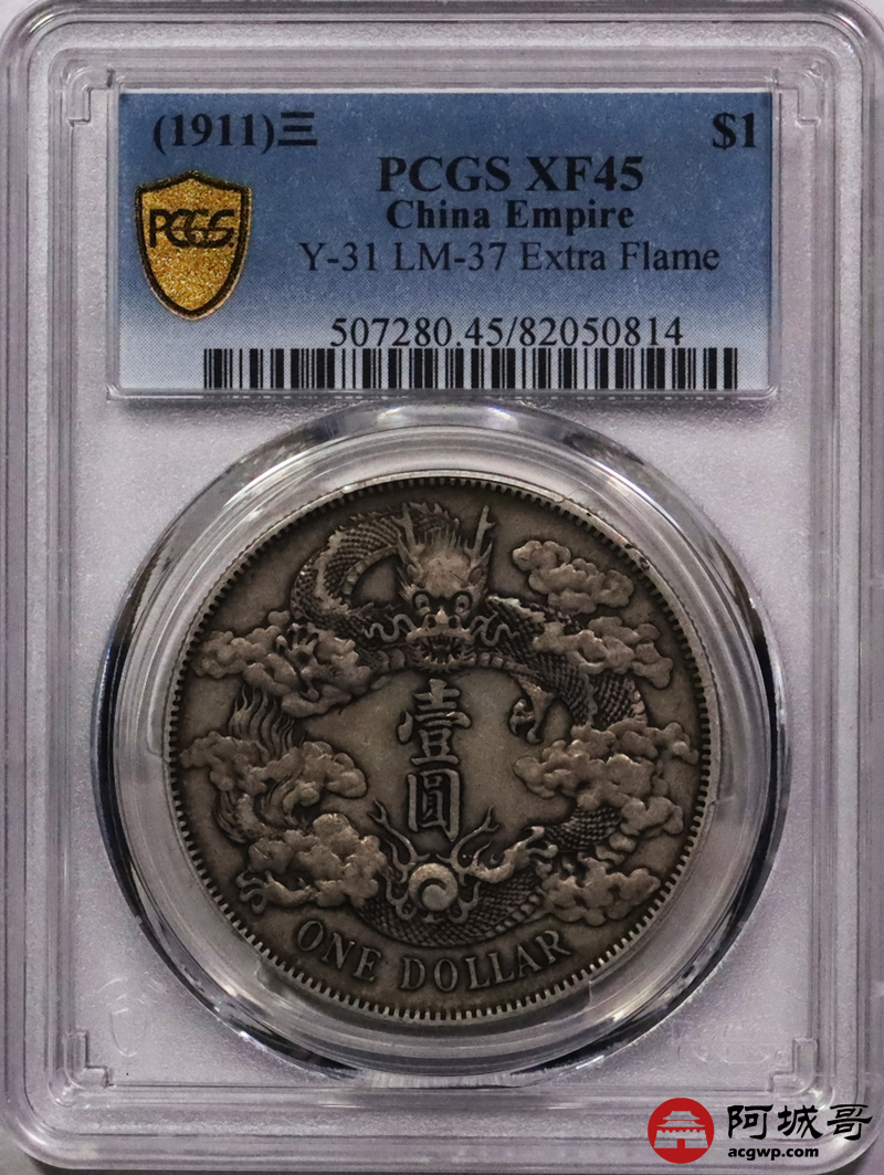 Lot:3041 1911宣统三年大清银币壹圆一枚,卷尾酱彩全深打PCGS XF45评级编号:82050814