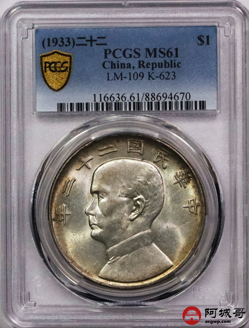 Lot:3551 1933民国二十二年孙中山像背帆船壹圆银币一枚,黄油原光 PCGS MS61