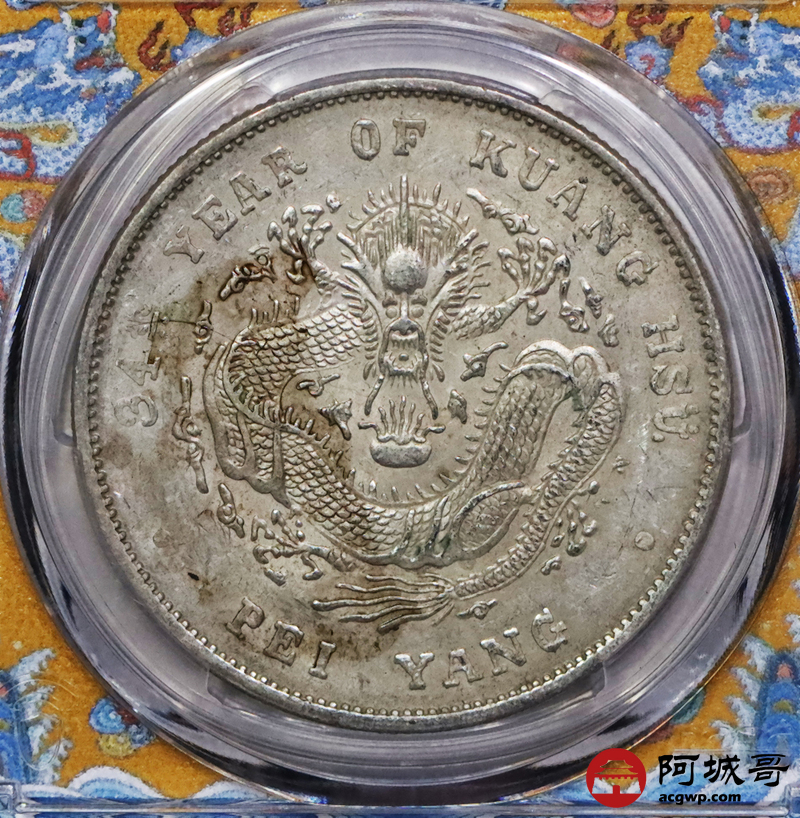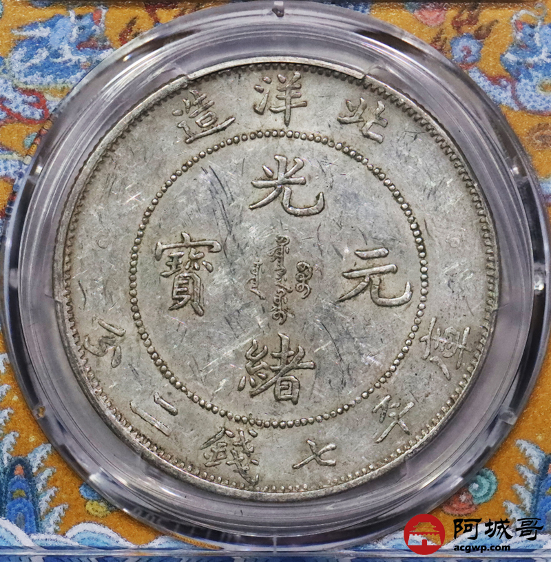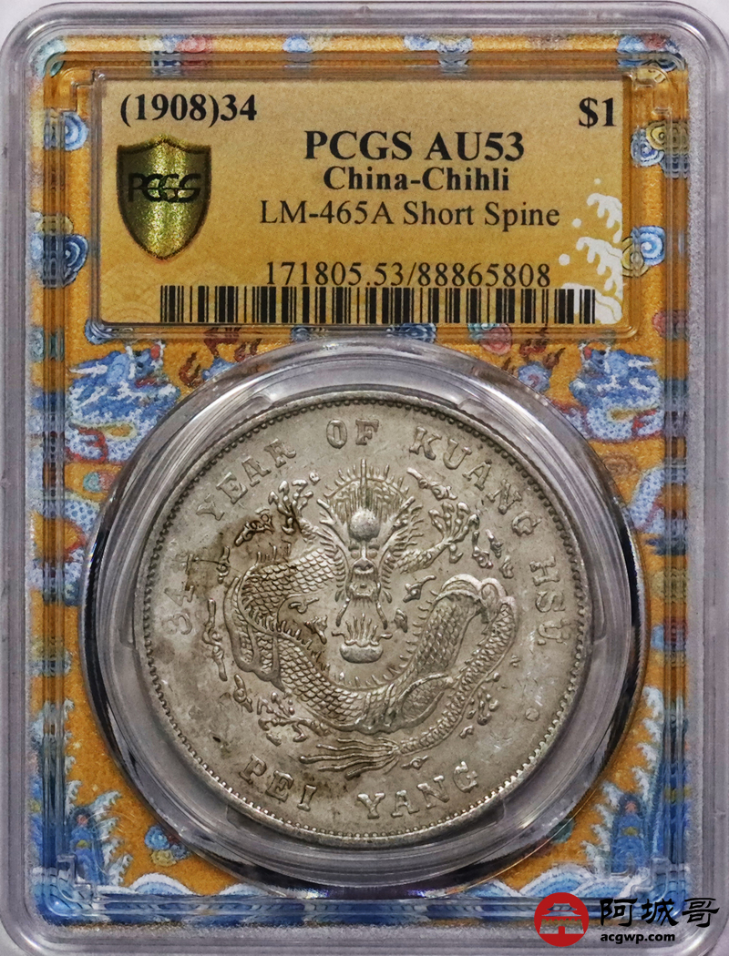 Lot:3300 1908光绪三十四年北洋造光绪元宝库平七钱二分 原光深打满龙鳞 PCGS AU53评级编号:88865808