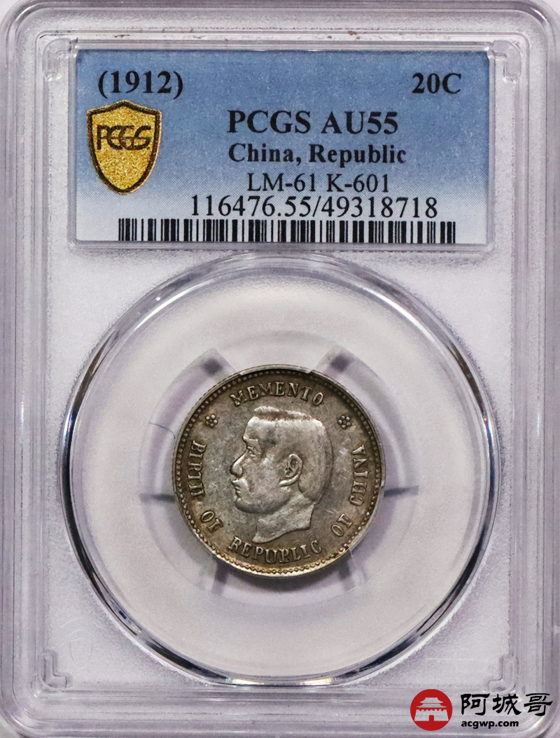 Lot:3119 1912孙中山像开国纪念贰角银币一枚,黄油原味底板 PCGS AU55评级编号:49318718